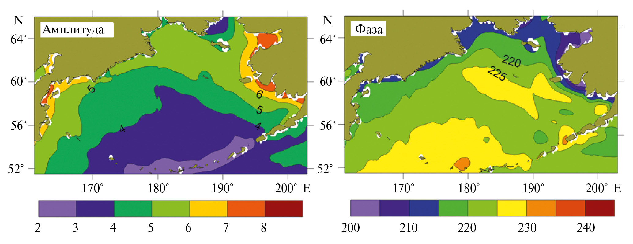 Рис. 4. Пространственное распределение амплитуды (°С) и фазы (°) годовой гармоники ТПМ на акватории Берингова моря.