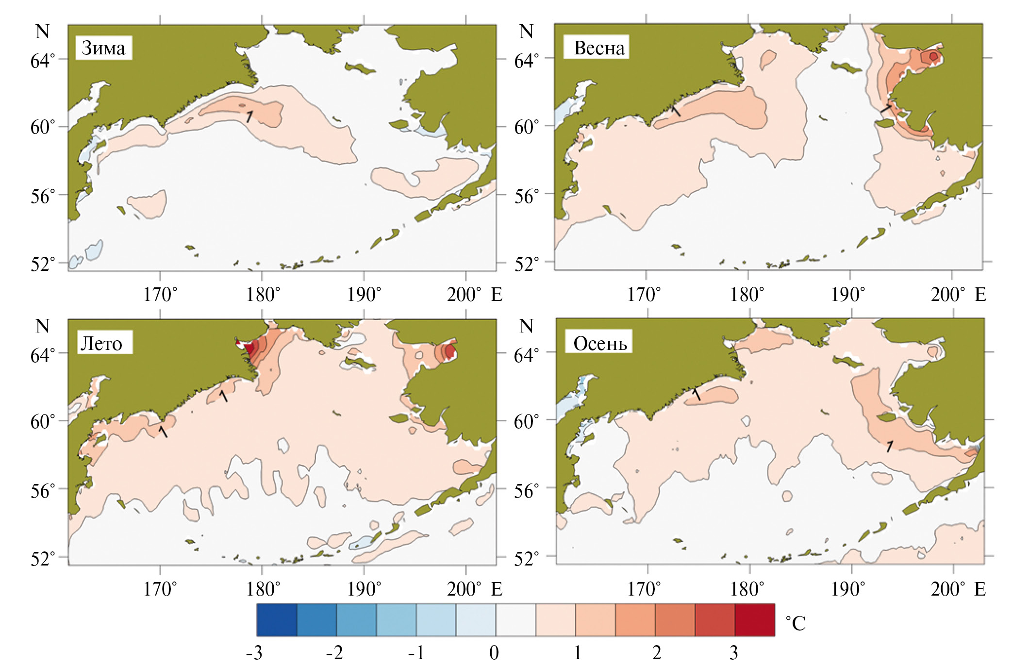 Температура поверхности Берингова море имеет выраженную тенденцию к повышению, что можно рассматривать как результат влияния глобального потепления, в то время как в Охотском море и северной части Японского реакция на эти процессы иная и преобладает снижение ТПМ (Ложкин, Шевченко, 2019). Особенно она проявляется в летний период, когда примерно на 75 % его акватории значения коэффициента линейного тренда выше 0,5°C/10 лет, а в западной части Анадырского залива и в вершине залива Нортон-Саунд достигают максимальных 3°C/10 лет. Слабее всего тенденция к повышению температуры поверхностного слоя воды выражена зимой.