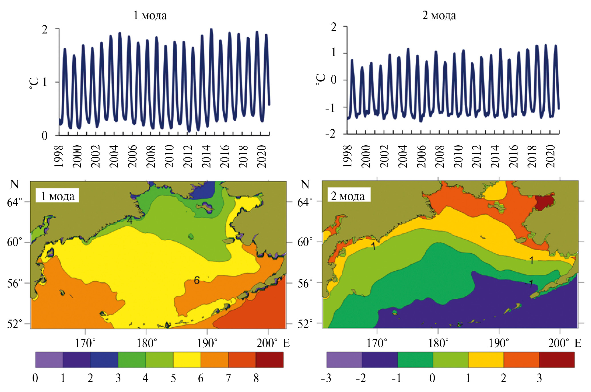 Вторая мода также содержательна, ее пространственная функция положительна в мелководных районах Берингова моря и отрицательна в глубоководной части, прилегающей к Алеутским островам, что отражает различие в термическом режиме этих акваторий. Следовательно, она отражает формирование гидрологического фронта вдоль свала глубин, существующего в Беринговом море на протяжении большей части года. Также вторая мода ответственна за высокую степень прогрева прибрежных акваторий (заливы Нортон Сацунд, Карагинский, Анадырский) летом и выхолаживания зимой.