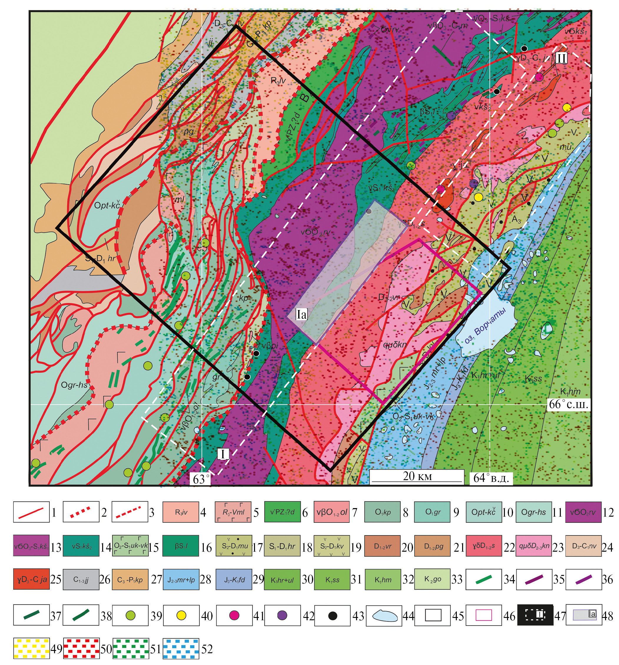 Рис. 2. Геологическая карта изучаемой территории по (Шишкин и др., 2007) упрощенная. Условные обозначения: 1–3 – разрывные нарушения достоверные: 1 – выходящие на поверхность, 2 – надвиг, 3 – шарьяж; 4 – хараматалоуская свита с чередованием графитоидно-кварцевых сланцев, графитоидных кварцитосланцев, слюдистых сланцев, кварцитов, эпидот-альбитовых амфиболитов, хлорит-альбитовых сланцев, гондитов; 5–6 – ультрамафит-метагабброноритовый дзеляюский комплекс с гипербазитами, габброноритами, амфиболитами; 7 – габбродолеритовый-абисальный орангьюганско-лемвинский комплекс с габбро-долеритами, долеритами, пикродолеритами, пикритами, дайками габбродолеритов; 8 – кокпельская свита с массивными и миндалевидными метабазитами, спилитами, алевролитами и аповулкагенными сланцами; 9 – грубеинская свита с алевролитами, филлитовыми сланцами и алевропесчаниками; 10 – нерасчлененные пагатинская, кибатинская и камчатская свиты с песчаниками, алевролитами известковистыми, алевритистыми известняками и петельчатыми известняками; 11 – грубеинская и харбейшорская свиты с лиловыми и зелеными алевролитами, филлитовыми сланцами, алевропесчаниками и песчаниками; 12 – дунит-гарбуцитовый с дунитами райизско-войкарский комплекс, дунит-гарбуцитовая ассоциация с сетчато-жильными и полосчатыми выделениями дунитов, нерасчлененные гипербазиты; 13–14 – кэшорский дунит-верлит-клинопироксенит-габбровый комплекс: 13 – первая фаза с дунитами, нерасчлененными верлитами, лерцолитами, 14 – вторая фаза с габбро, габброноритами, габбродиоритами, диоритами, дайками габбро; 15 – усть-конгорская и войкарская свиты нерасчлененные с подушечными и пластовыми спилитами, прослоями и линзами яшмоидов; 16 – лагортаюский комплекс с габбродолеритами, долеритами параллельных даек; 17 – малоуральская свита с туфами базальтов, разнообломочных андезибазальтов, базальтов, дацитов, прослои туфопесчаников, туффитов с линзами рифтогенных известняков; 18 – харотская свита с углисто-глинистыми сланцами, фтанитами, пачками петельчатых известняков на венлокско-лудловском и пражско-эмском уровнях; 19 – кевсоимская свита с трахиандезитами, трахитами и их туфами, конгломератами, гравелитами, песчаниками, яшмоидами и известняками, среднего состава с лавами; 20 – варчатинская свита с метабазитами, метаандезитами, метадацитами и их туфами, конгломератами, гравелитами, туфопесчаниками, туффитами, известняками; 21 – пагинская свита с песчаниками кварцевыми, алевролитами, аргиллитами, прослоями кремнисто-глинистых сланцев; 22 – диорит-тоналит-плагиогранитовый собский комплекс с гранодиоритами, тоналитами; 23 – монцогранодиоритовый конгорский комплекс с кварцевыми монцодиоритами плутоническими, кварцевыми монцодиоритами, гранодиоритами и диоритами; 24 – няньворгинская свита с алевроглинистыми, глинисто-кремнистыми, углисто-кремнистыми сланцами и фтанитами; 25 – гранитовый плутонический янославский комплекс с гранитами биотит-роговообманковыми, лейкогранитами и аляскитами; 26 – яйюская свита с граувакками, полимиктовыми песчаниками, известковистыми алевролитами, глинистыми сланцами, прослоями известняков и доломитами, 27 – кечпельская свита с мелкоритмичным переслаиванием полимиктовых мелкозернистых песчаников, алевролитов и аргиллитов; 28 – средняя юра, батский ярус – верхня