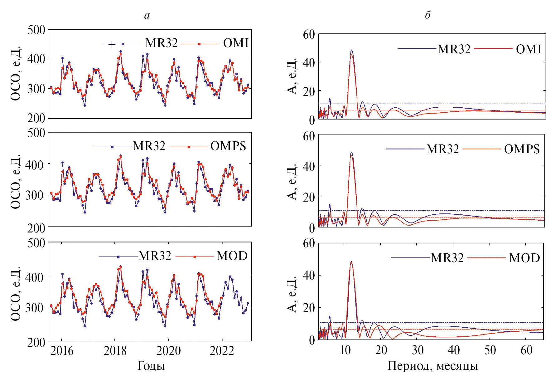 Рис. 5. Среднемесячные ряды ОСО по наземным и спутниковым данным (а) и их амплитудные спектры (б). На спектрах горизонтальные штриховые линии соответствуют значимости спектральных гармоник 2σ.