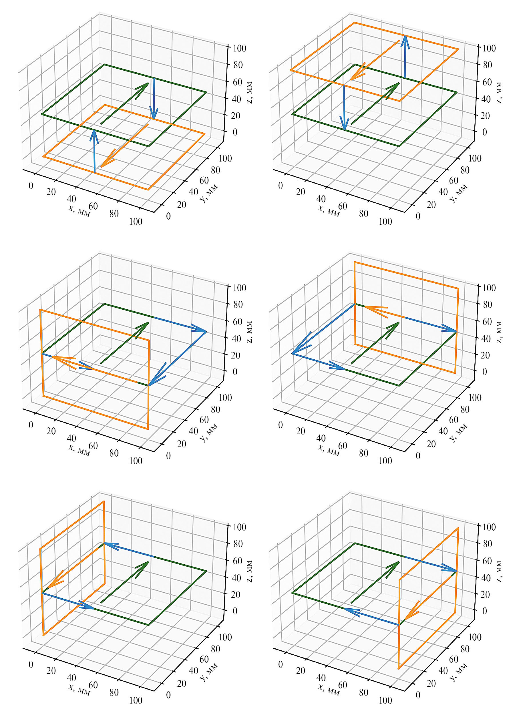 На рис. 1 показаны направления токов в контурах при рассмотрении каждой из солнечных панелей аппарата. Указанные выше конфигурации расчета, в которых происходит одновременная засветка одной, двух и трех панелей, являются комбинацией приведенных на рисунке случаев. Зеленым цветом показан контур платы электроники аппарата, синим – соединительные провода между платой и контуром солнечных батарей, оранжевым – контур солнечных батарей. Токовый контур узла электроники, состоящий из платы управления (зеленый цвет) и платы питания с аккумулятором (красный цвет) приведен на рис. 2. Расстояние между платами составляет 10 мм.