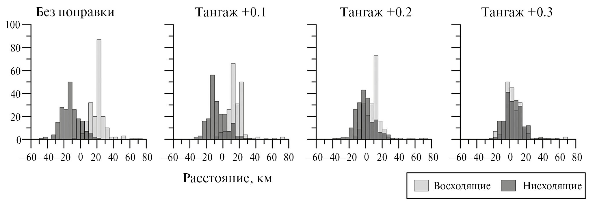 В работе (Садовский, Сазонов, 2022(б)) было показано, что смещение горизонтальной береговой линии вдоль направления движения спутника определяется углом тангажа. Поэтому было принято решение скорректировать этот угол вручную и проверить, как изменятся показатели точности геопривязки. Для этого были выполнены расчеты карт береговых линий, аналогичных представленных на рис. 6. При этом вводилась ручная коррекция угла тангажа, которая составила +0.1°, +0.2° и +0.3° (относительно найденного в автоматическом режиме значения –0.09°). Статистические оценки полученных показателей точности для всех трех вариантов приведены в табл. 1 и на рис. 7). суммарная точность географической привязки с коррекцией тангажа +0.3° составила 7.62 ± 10.64 км, что почти вдвое лучше, чем с нулевой коррекцией.