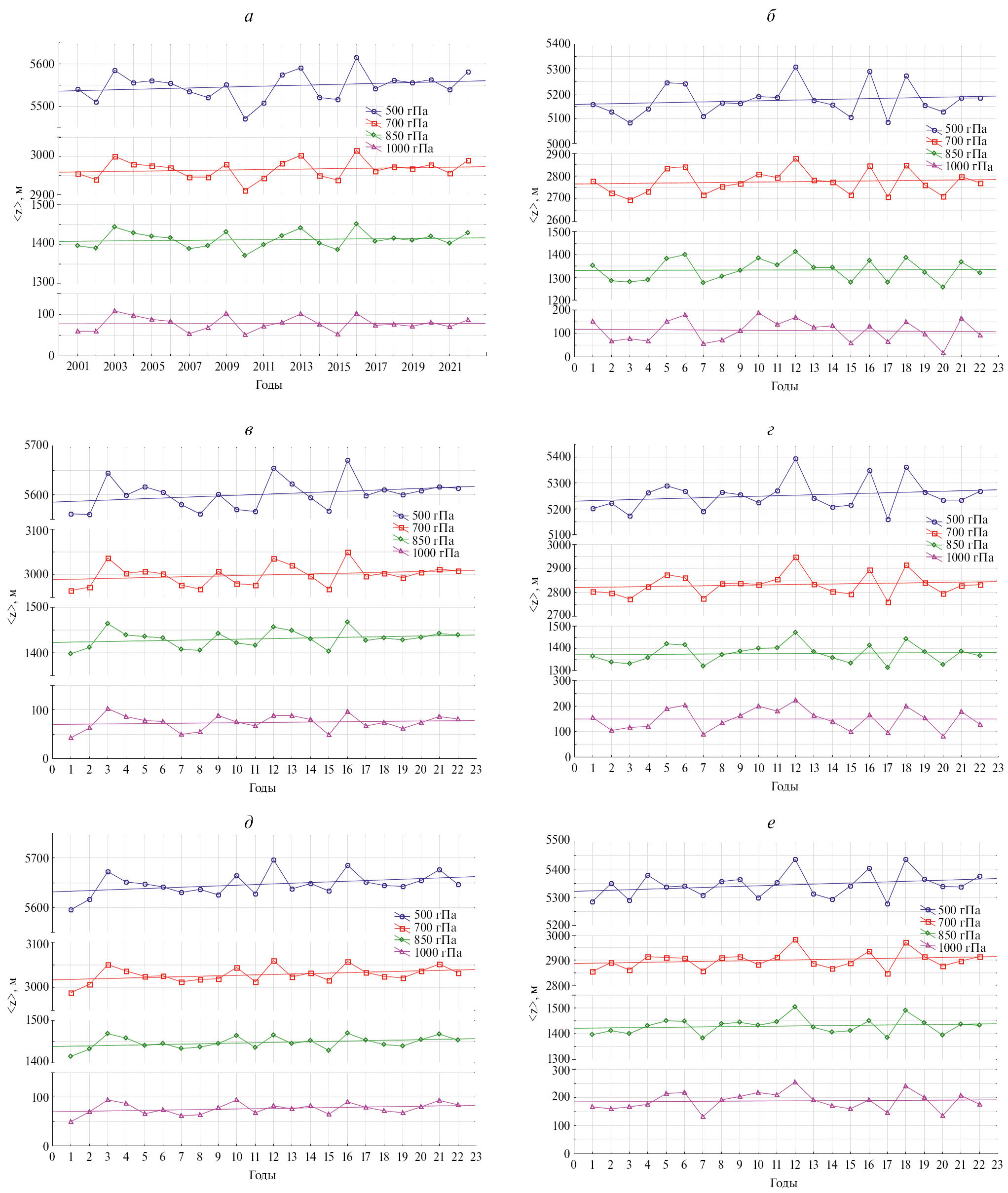 Рис. 3. Временные ряды дневных высот геопотенциала на уровнях 500, 700, 850 и 1000 гПа в северной, переходной и южной зонах Западной Сибири летом (а, в, д) и зимой (б, г, е) соответственно.