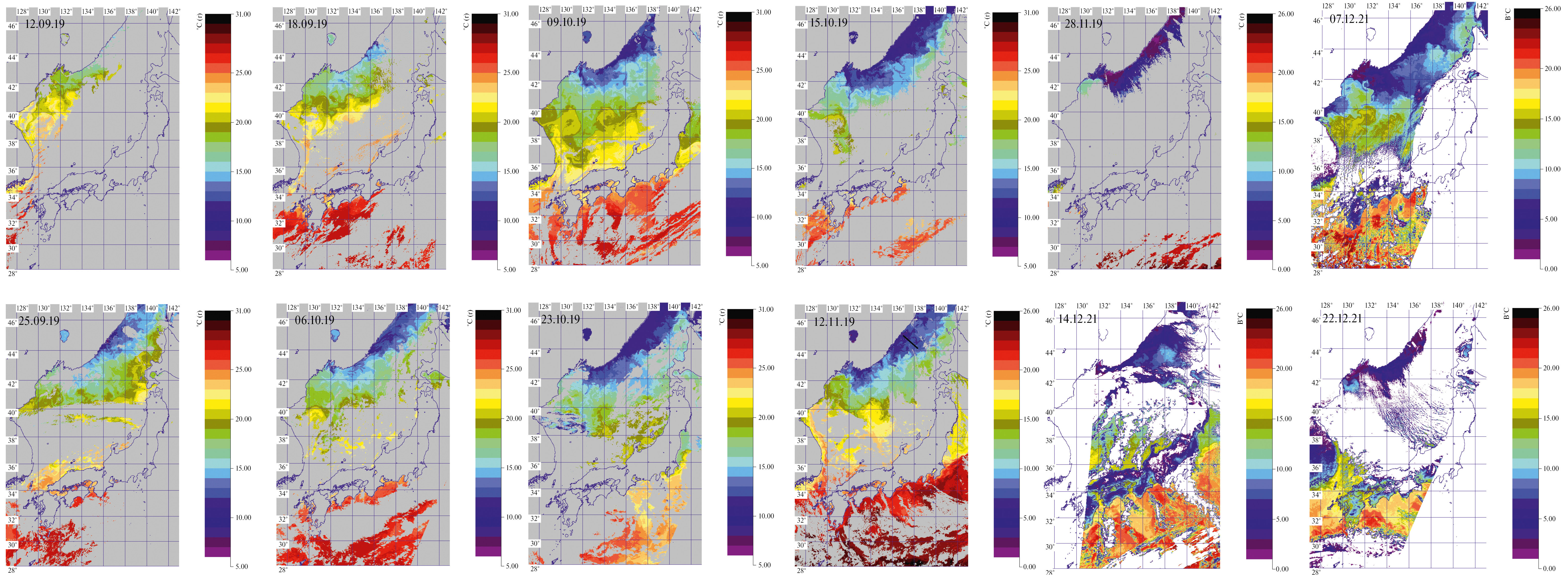 Рис. 2. Термическая структура поверхности Японского моря по данным спутниковых ИК-изображений в сентябре–ноябре 2019 г. и декабре 2021 г. В сентябре и октябре шкалы температур от 5°С до 31°С, в ноябре и декабре ‒ от 0°С до 26°С. На снимке от 12 ноября 2019 г. черным отрезком обозначен разрез, результаты которого приведены на рис. 8.