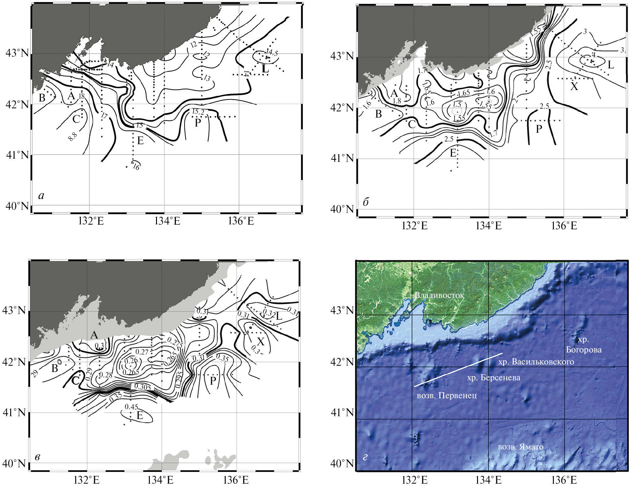 Рис. 4. Распределение потенциальной температуры воды в октябре 2019 г. на поверхности (а) и горизонтах 100 м (б) и 1000 м (в); рельеф дна района работ – белая линия, проходящая через возвышенность Первенец и хребты Берсенева и Васильковского, совпадает с осевой линией области максимального подъема глубинных вод, выделяемой по минимальным температурам на рисунках б и в–г. Точки (·) – местоположение станций. Латинскими буквами на рисунках а, б и в обозначены вихревые образования.