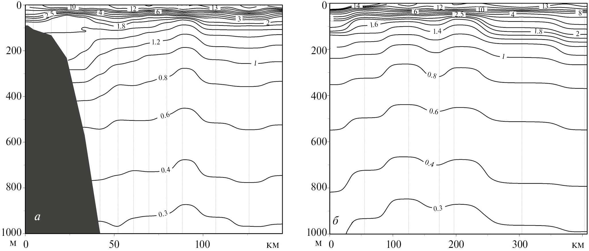 На меридиональном и квазизональном разрезах, пересекающих район работ соответственно по 134° в.д. (рис. 5а) и с юго-запада от 41°45′ с.ш. 131°48′ в.д. на северо-восток до 43°20′ с.ш. 135°56′ в.д. (рис. 5б), наблюдается куполообразный подъем изотерм с общей вершиной в районе 42° с.ш. между меридианами 132° в.д. и 134.5° в.д., что свидетельствует о подъеме глубинных вод с нижних горизонтов измерений и почти до поверхности (примерно до 50 м). В результате подъема глубинных вод и сформировались области с пониженными температурами относительно соседних районов на площадных распределениях (рис. 4б, в). На разрезе северо-восточного направления (рис. 5б) в структуре глубинного апвеллинга наблюдаются две вершины. Для построения северо-восточного разреза, показанного ломаной линией на рис. 1а, на каждом из семи используемых разрезов выбиралась станция, на которой наблюдался максимальный на разрезе подъем изотерм. Поэтому северо-восточный разрез распределения температуры представляет вертикальный срез, проходящий по двухвершинному температурному хребту.