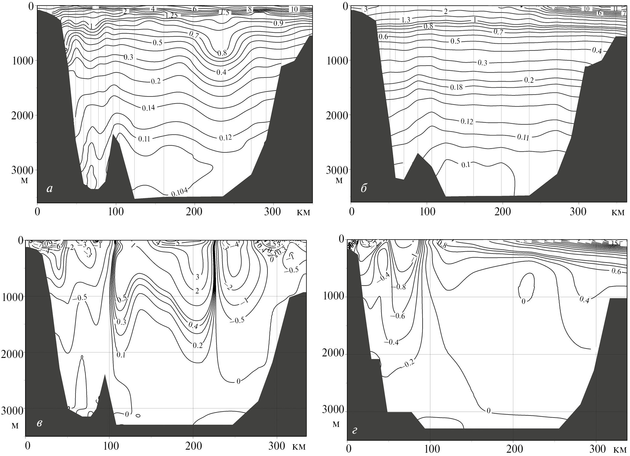 На рис. 7в, г отчетливо видно, что нулевые изотахи разделяют западный и восточный потоки в районе расположения вершины апвеллинга и хребта Васильковского. Отсюда связанный с глубинным апвеллингом циклонический круговорот, расположенный в области ЗЦК, является крупным топографическим вихрем, сформированным, вероятно, при взаимодействии набегающего потока с положительными формами рельефа дна (Козлов, Дарницкий, 1981; Зырянов, 1995; Дарницкий, 2010) ‒ хребтами Васильковского, Берсенева и возвышенностью Первенец. Большая часть западного прибрежного потока – Приморского течения обтекает поднятия с севера, образуя северную периферию КЦК и ее западной структуры ЗЦК. В структуре топографического вихря выделяются два небольших по размеру циклонических вихря, центры которых связаны с двумя вершинами глубинного апвеллинга на рис. 4б, в. Эти вершины выделяются и в распределении температур на северо-восточном разрезе на рис. 5б. Один вихрь формируется над хребтами Васильковского и Берсенева, второй располагается между возвышенностью Первенец и хребтом Берсенева (рис. 4б, в и 6а, б). Экспериментальное выявление топографического фактора в формировании циклонического круговорота и апвеллинга в западной части КЦК пришлось на осенний и зимний сезоны. На данный момент отсутствуют аналогичные исследования в весенне-летний период, что не позволяет сделать однозначные выводы о соотношении факторов циклонической завихренности и топографии в происхождении глубинного апвеллинга и сезонной изменчивости его местоположения.
