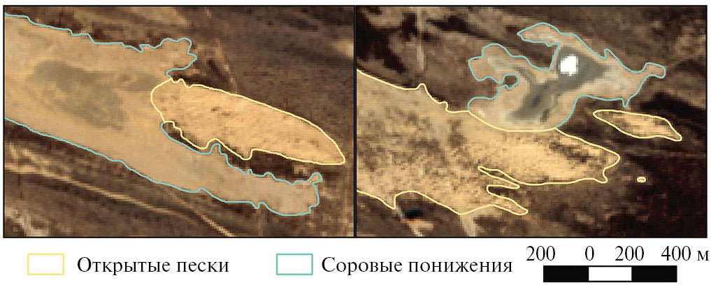 Рис. 1. Открытые пески и соровые понижения на фрагментах спутникового снимка (от 21.10.2023 г.).