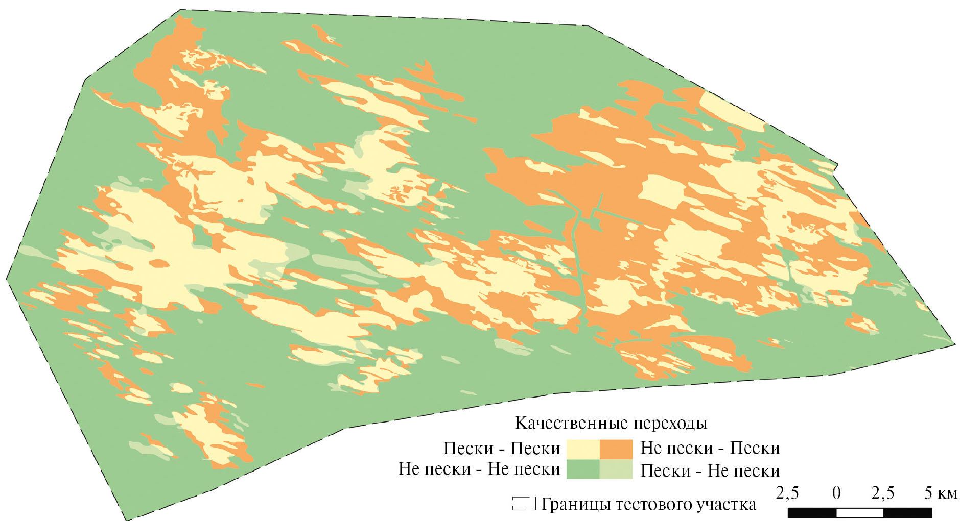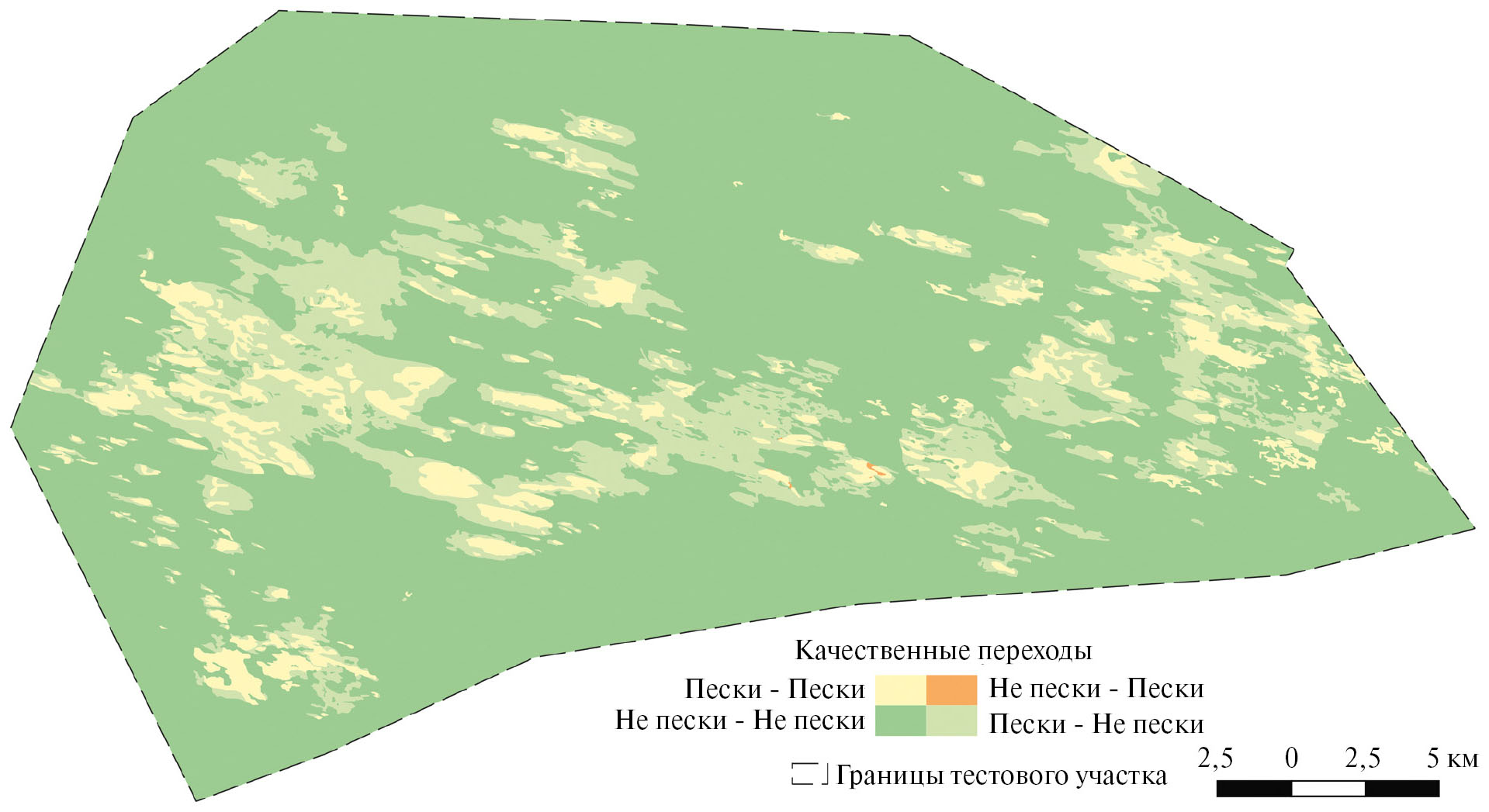 В июле-августе 2022 г. под воздействием пыльных бурь площадь открытых песков увеличилась в 1.9 раза, т.е. переходу “Не пески – Пески” было подвержено 19.6 тыс. га, а переход “самих в себя” (“Пески – Пески”), т.е. сохранение класса выявлено на площади 17.1 тыс. га (рис. 5). Высокая ветровая нагрузка значительно ухудшает условия вегетации растительности и препятствует зарастанию песков (Биарсланов и др., 2023). При этом выявлен также переход “Пески - Не пески” на площади 1.9 тыс. га, связанный с очисткой соровых понижений от нанесенного ранее слоя песка, а также с зарастанием деструктивных областей очагов опустынивания. Площади, не занятые песками, занимали около 55% общей площади тестового участка.