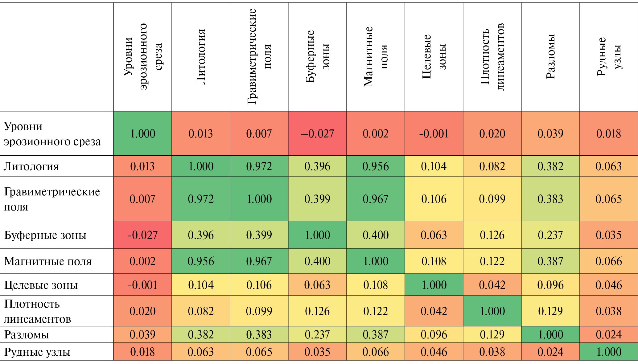 Как можно заметить, очень сильную корреляцию демонстрируют геофизические данные и литологический состав горных пород. Также наблюдается слабая корреляция у буферных зон и разломов. Остальные данные имеют очень слабую корреляцию.