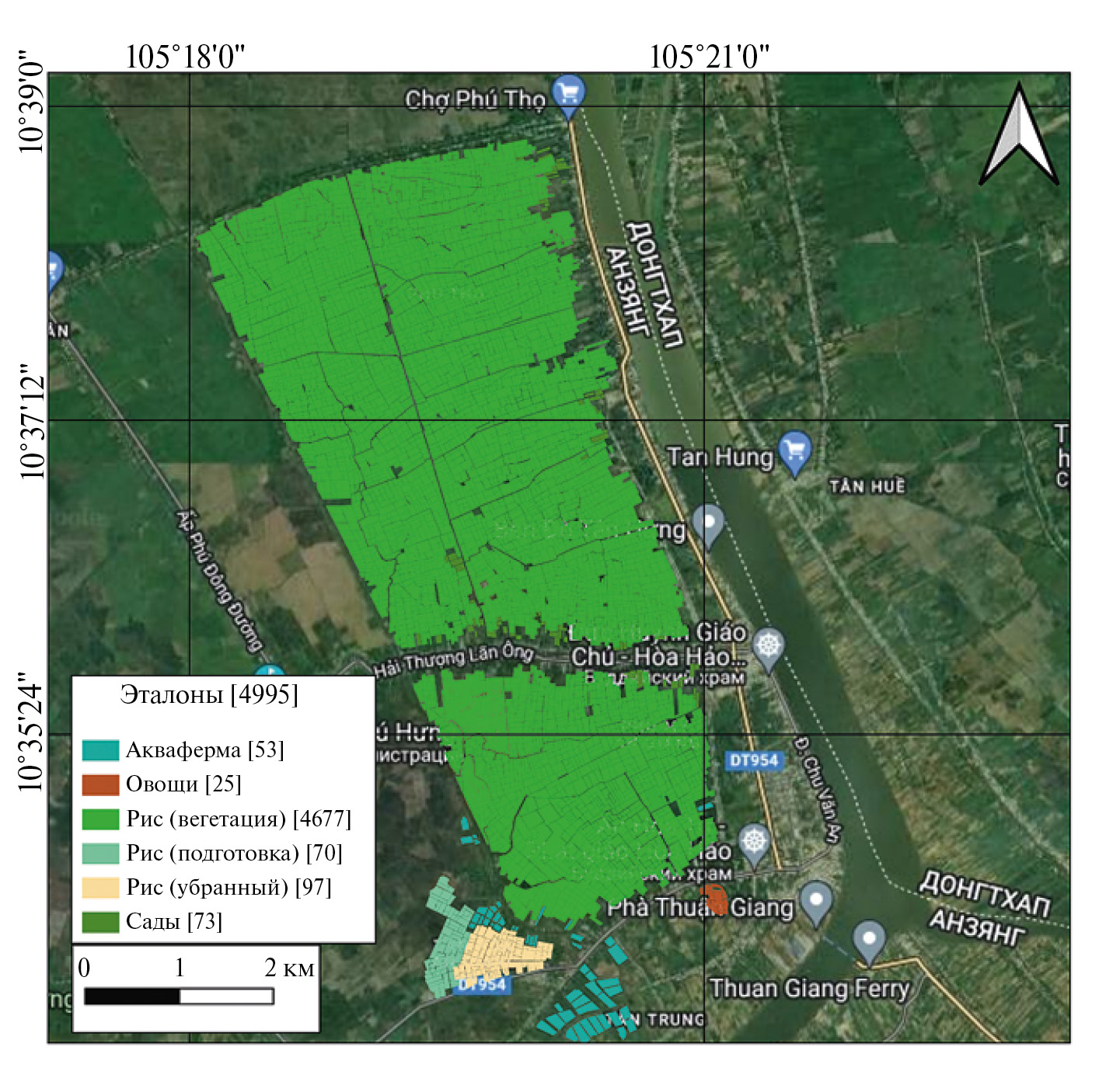 В процессе геоинформационного мониторинга состояния рисовых полей в провинции Анзянг (Вьетнам) по мультиспектральным данным ДЗЗ и полевого спектрорадиометрирования на территории исследований разработана локальная ГИС размещения, проведено картографирование границ используемых участков на тестовом полигоне за последние 3 года, при этом выделено контурами: 4677 рисовых полей в состоянии вегетации (2091 га), 97 полей убранного риса (37 га), 70 – подготовленных к посадке (33 га), 25 полей овощей (6 га), 52 аквафермы (44 га), 73 сада (22.3 га).