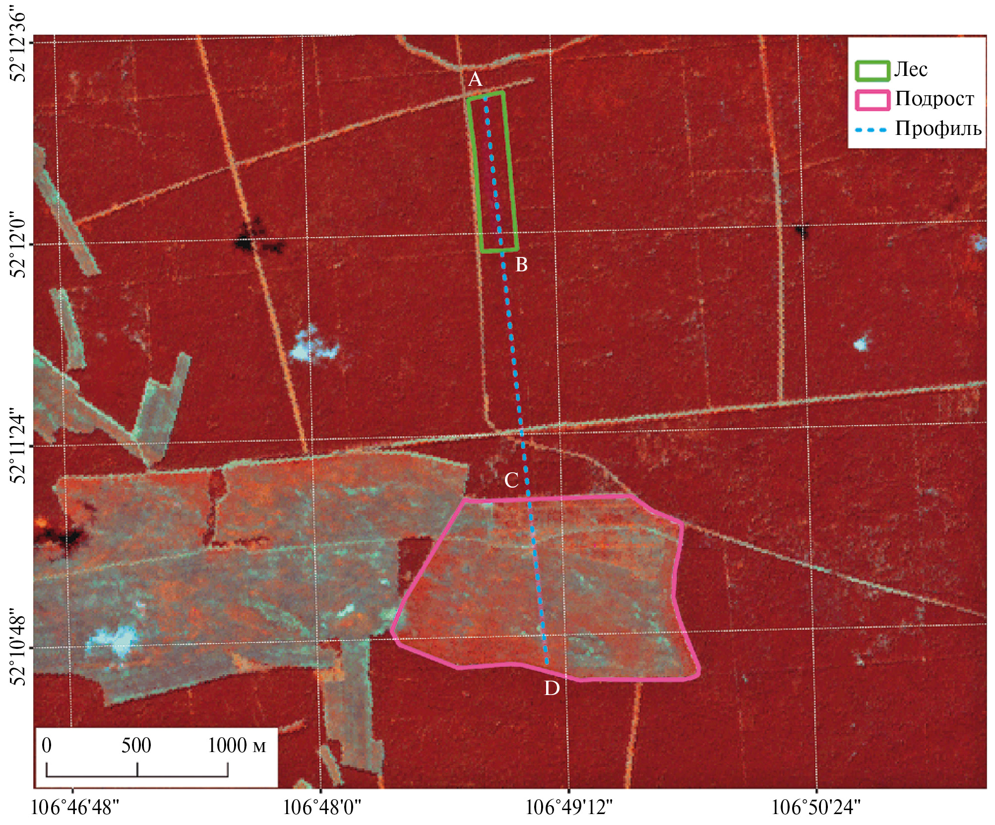 Как было показано ранее в работе (Дмитриев и др., 2022), залесение тестового полигона происходило неравномерно, что визуально можно наблюдать и на рис. 1. Первой начала интенсивно зарастать восточная часть полигона – контур розового цвета. Возраст этого молодого леса составлял 18–20 лет. В качестве контрольного участка для сравнения использовался фрагмент зрелого плотного леса (контур зелёного цвета на рис. 1), который оставался неизменным на всем протяжении периода наблюдений. Между этими участками расположен фрагмент леса с рубками прореживания, которые были выполнены в 2017–2018 гг. Временной ряд используемых радиолокационных данных охватывал этот период рубок. Для наглядности, далее по тексту количественные результаты представлялись на основе анализа профиля (см. рис. 1), проходящего от точки А до точки D. Соответственно зрелый плотный лес располагался на профиле от точки А до точки В, а лесной подрост на профиле от точки C до точки D. Между ними от точки В до точки С располагался лес с рубками прореживания.
