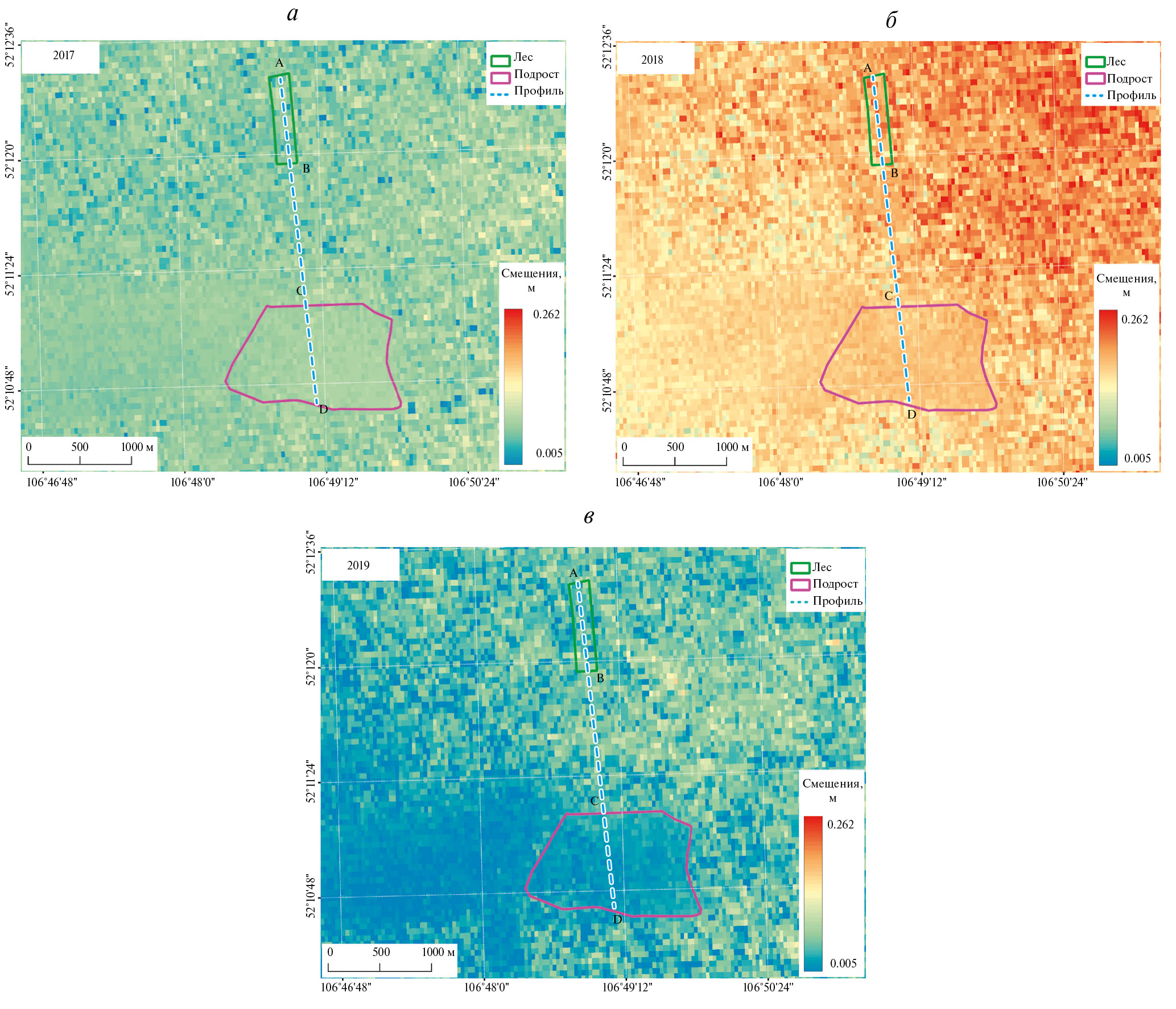 На рис. 2 представлены результаты, полученные методом Stacking-InSAR по этим временным рядам, а на рис. 3 соответствующие профили вдоль линии ABCD. Для удобства профили разделены на отрезки (см. рис. 1) с соответствующими линейными трендами для зрелого леса (АВ), леса с рубками прореживания (ВС) и молодого леса (CD). Представленные результаты показали, что максимальный прирост всех участков соснового леса наблюдался в вегетационный период 2018 г. и составлял величину порядка 20 см/год. При этом для зрелого леса без рубок разброс данных, полученных в 2018 г., варьировался в пределах 15÷22 см/год, а для леса с рубками отмечался разброс значений прироста от 10 до 22 см/год. Можно предположить, что смещение нижней границы значений прироста с 15 до 10 см/год было связано с рубками леса.