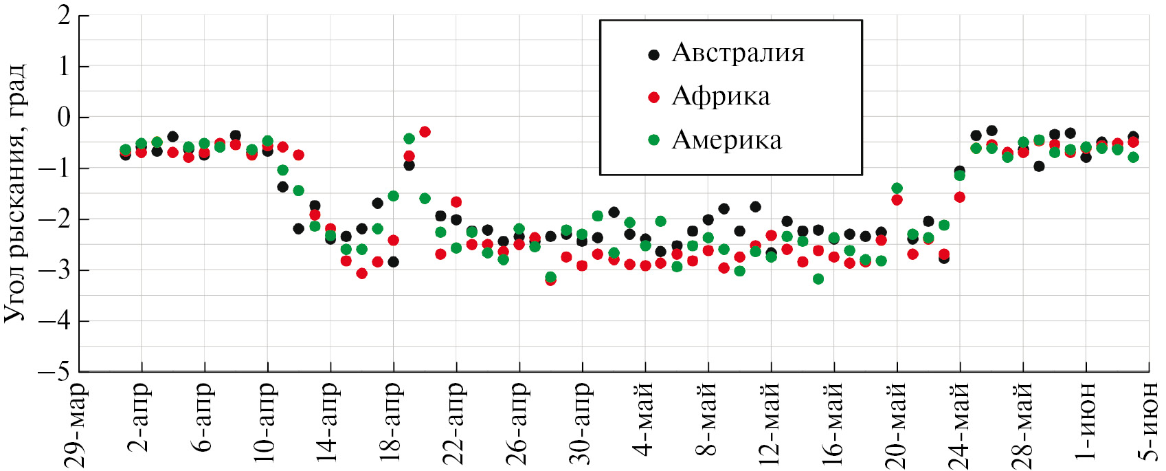 Полученный временной ход зависимости корректирующего угла рыскания схож с результатами визуального анализа, представленного на рис. 2. Особенности работы с суточными композитами при реализации машинной обработки существенно (более чем в 24 раза – по числу полувитков за сутки) снижают временное разрешение проводимого анализа, поэтому особенности “переходного” периода (11–13 апреля), наблюдаемые при ручной обработке данных, на нем не видны. При этом сам переход в характеристиках оборудования (если они являются причиной сбоя) достаточно четко прослеживается и в машинном варианте.