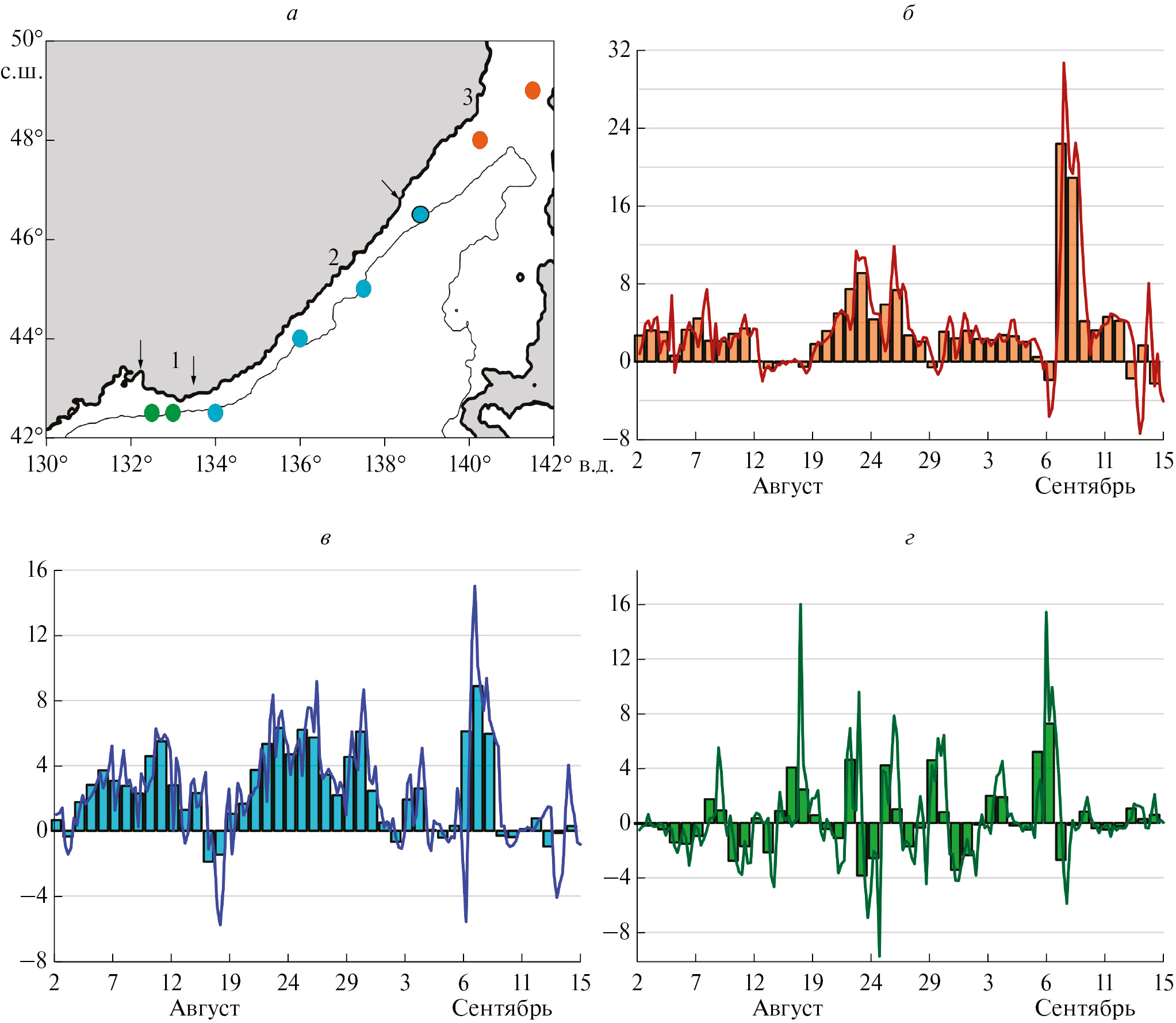где α – угол между соответствующей параллелью и прямой, аппроксимирующей среднюю береговую линию, Qx и Qy – значения зональной и меридиональной составляющих ветрового переноса. В этом случае Qx = τy / ρf, Qy = –τх / ρf, где τх и τy – значения зональной и меридиональной составляющих касательного напряжения ветра, ρ – плотность морской воды (1025 кг/м3), f – параметр Кориолиса. Касательное напряжение ветра рассчитывались по уравнениям, предложенным в работе (Large, Pond, 1981). Расчеты ИА были выполнены для точек, в которых в августе–сентябре 2022 г. на картах распределения ТПМ в прибрежных районах наблюдались холодные воды апвеллинга. Положение точек, для которых рассчитывалось значение этого индекса, показано на рис. 2а. Результаты расчетов ИА осреднялись в пределах трех основных зон апвеллинга: Южного Приморья, Восточного Приморья и Татарского пролива. При выделении районов учитывалась ориентация береговой линии. Для Южного Приморья отчетный угол α составлял 180°, для Восточного Приморья – 315°, для Татарского пролива – 330°. Для получения размерности, соответствующей скорости объемного переноса вод ИА нормировался на единицу длины береговой линии (м3/с/10 м береговой линии). Положительные значения ИА соответствуют направленному от берега ветровому переносу, который вызывает прибрежный апвеллинг. Отрицательные значения ИА соответствуют даунвеллингу (опусканию вод). В общем случае ИА позволяет определить временные интервалы с благоприятными для развития апвеллинга ветровыми условиями и количественно оценить относительную интенсивность этого процесса.