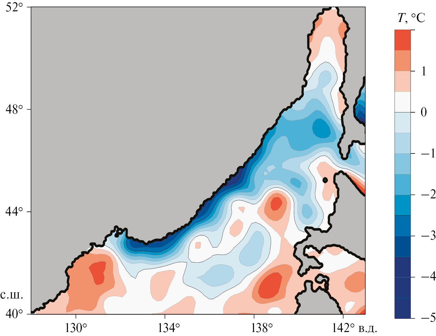 Общий эффект влияния интенсивного прибрежного апвеллинга и тайфуна Хиннамнор на термическую структуру поверхностного слоя можно оценить, рассмотрев распределение аномалий ТПМ в северной части Японского моря. На рис. 7 показано пространственное распределение аномалий ТПМ в сентябре 2022 г. Аномалии рассчитывались относительно средних значений ТПМ в сентябре за 1982–2023 гг. (период глобальных наблюдений за распределением ТПМ спутников NOAA). В сентябре 2022 г. северо-западной части Японского моря преобладали отрицательные аномалии среднемесячных величин поверхностной температуры. Область максимальных значений аномалий ТПМ была расположена в зоне прибрежного апвеллинга у побережья Приморья. Максимальные амплитуды (до –4.0°С) соответствовали ядрам апвеллинга, расположенным на приморском шельфе. Высокие отрицательные значения амплитуд (до –2.0°С) были связаны с зоной адвекции холодных вод апвеллинга в центральную часть моря (~ 45° с.ш.) и с областью холодных струйных течений в южной части Татарского пролива. Таким образом, совместное влияние интенсивного прибрежного апвеллинга и тайфуна Хиннамнор привело к формированию отрицательных аномалий ТПМ в северо-западной части Японского моря.