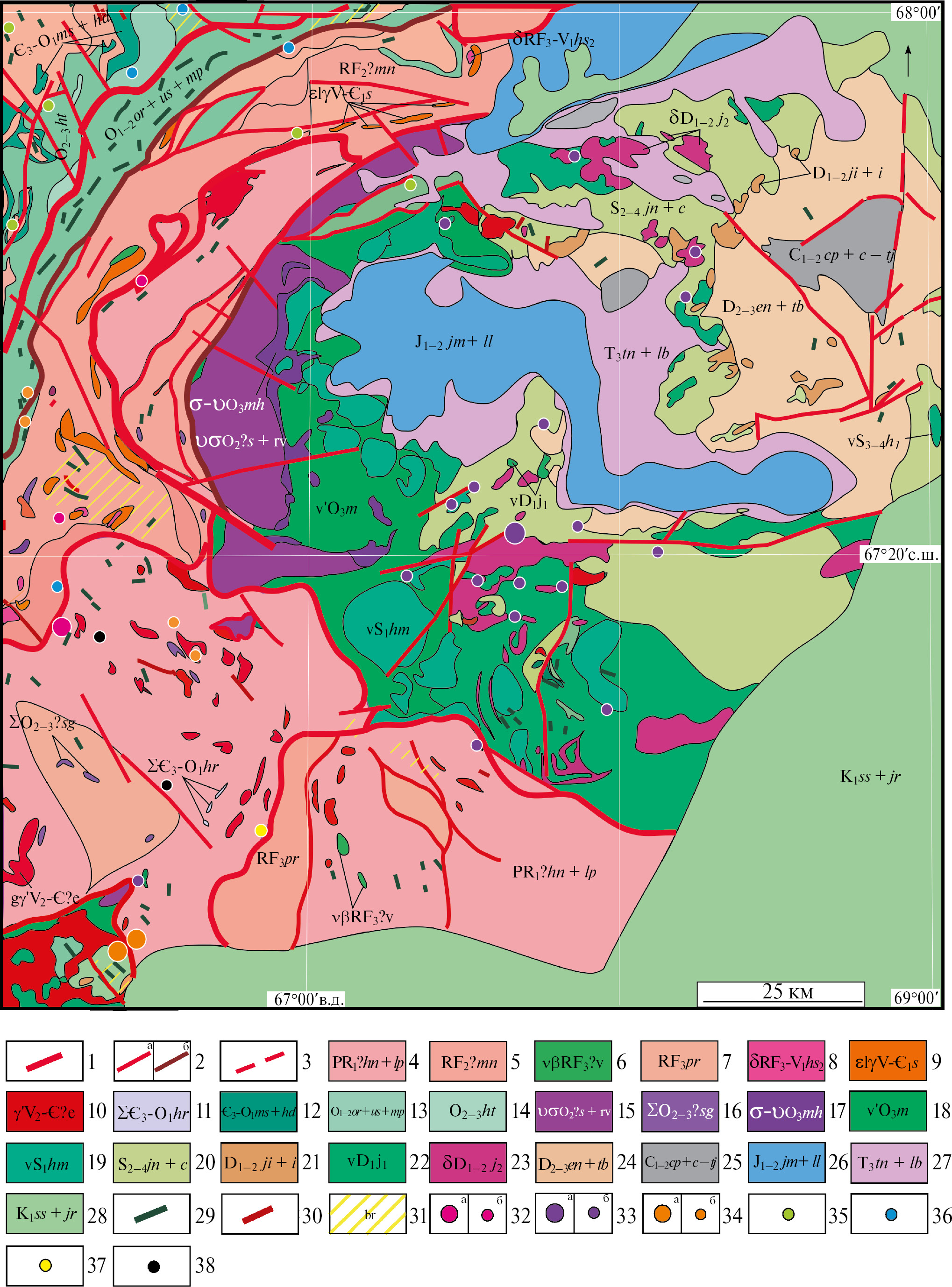 Рис. 2. Упрощенная геологическая карта изучаемой территории по (Зылева и др., 2014): 1-2 – достоверные разрывные нарушения: 1 – шарьяж, 2 – надвиг и взбросо-надвиг (а), рудоконтролирующие (б), 3 – предполагаемые разрывные нарушения: надвиги, взбросо-надвиги и поддвиги, 4–28 – свиты, толщи и комплексы: 4 – объединенные ханмейхойская и лаптаюганская свиты, содержащие амфиболиты с гранатами, прогнейсы, реже гнейсы, линзы мраморов, железистые кварциты и гондиты; 5 – минисейшорская свита, включающая метабазальты, углеродисто-серицит-кварцитовые филлитовидные, хлорит-серицит-альбит-кварцевые сланцы, прослои метапесчаников и метаалевролитов; 6 – васькеуский комплекс со штоками и дайками метагаббродолеритов; 7 – париквасьшорская свита с кристаллосланцами, сланцами и плагиогнейсами; 8 – харбей-собский комплекс с диоритами и кварцевыми диоритами; 9 – сядатаяхинский комплекс с гранитами и монцогранитами, дайками гранитов; 10 – евъюганский комплекс с метагранитами и метааляскитами; 11 – хартманюшорский комплекс с дайками серпентинитов; 12 – объединенные минисейская и хойдышорская свиты с конгломератами, песчаниками, гравелитами, алевролитами и кварцитами; 13 – объединенные орангская, усинская и малопайпудынская свиты, включающая филлиты, углеродисто-кварцевые сланцы, алевролиты, конгломераты, гравелиты, прослои и линзы алевритов, песчаники, мраморизованные и алевритистые известняки, толеитовые базальты; 14 – хантейская свита с мраморированными известняками, сланцами и алевролитами; 15 – объединенные сыум-кеуский и райизко-войкарский комплексы с дунитами, лерцолитами, гарцбургитами; 16 – слюдяногорский комплекс с метаультрамафитами; 17 – малохадатинский комплекс, включающий верлиты, дуниты, клинопироксениты и вебстериты; 18 – малыкский комплекс с метагаббро, апогаббровыми амфиболитами; 19 – харампэйско-масловский комплекс, содержащий габбро и габбронориты; 20 – объединенные янганапэйская и карбонатная толщи с базальтами, андезибазальтами, дацитами, риодацитами, плагиориолитами и их туфами, прослоями и линзами песчаников, гравелитов, известняков, конгломератов; 21 – объединенные кремнисто-известняковая и известняковая толщи, включающие слоистые известняки, конгломераты, брекчии и линзы бокситов; 22–23 – первая и вторая фазы юньягинского комплекса с габбро, диоритами и гранодиоритами; 24 – объединенные енэорская и тальбейская толщи с песчаниками, алевролитами, аргиллитами, конгломератами, гравелитами, прослоями и линзами известняков, радиоляритов, лав трахибазальтов, линзами пепловых туффитов; 25 – объединенные карбонатно-песчаниковая, карбонатная и терригенно-известняковая толщи с известковистыми песчаниками, аргиллитами, алевролитами, конгломератами, гравелитами, известняками, единичными линзами мергелей и пепловых туффитов, 26 – объединенные яны-маньинская и тольинская свиты с песками, гравийниками, галечниками, конгломератами и пластами бурых углей; 27 – объединенные теунтойсхая и лаборовская свиты с пестроцветными песками, алевролитами и конгломератами; 28 – объединенные северососьвинская и яронгская свита, включающие пески, песчаники, алевролиты с прослоями алевролитовых и углистых глин и пластами бурых углей; 29–30 – разнообразные внемасштабные тела даек основного (29) и кислого (30) состава, с которыми связаны проявления 
