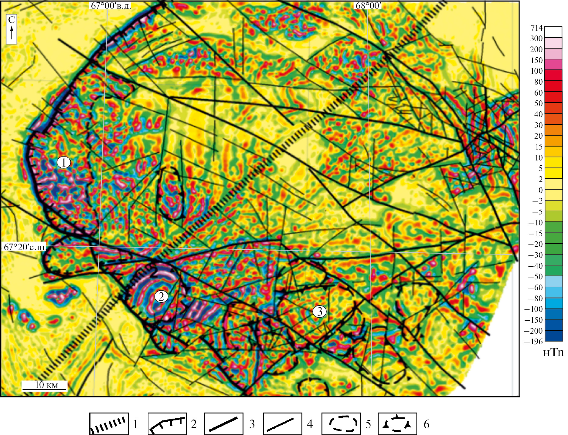 Рис. 4. Внутреннее строение Щучьинского синклинория в локальной составляющей магнитного поля (по Калмыков, Трусов, 2015): 1 – Ханмей-Сибилейская зона разломов, 2 – ГУР, 3–4 – разломы: главные (3), второстепенные (4), 5–6 – контуры интрузивных массивов: сыум-кеуский (5), харампэйско-масловский (6). Цифрами показаны интрузивные массивы: 1 – Сыум-Кеу, 2 – Масловский, 3 – Хоростоский.