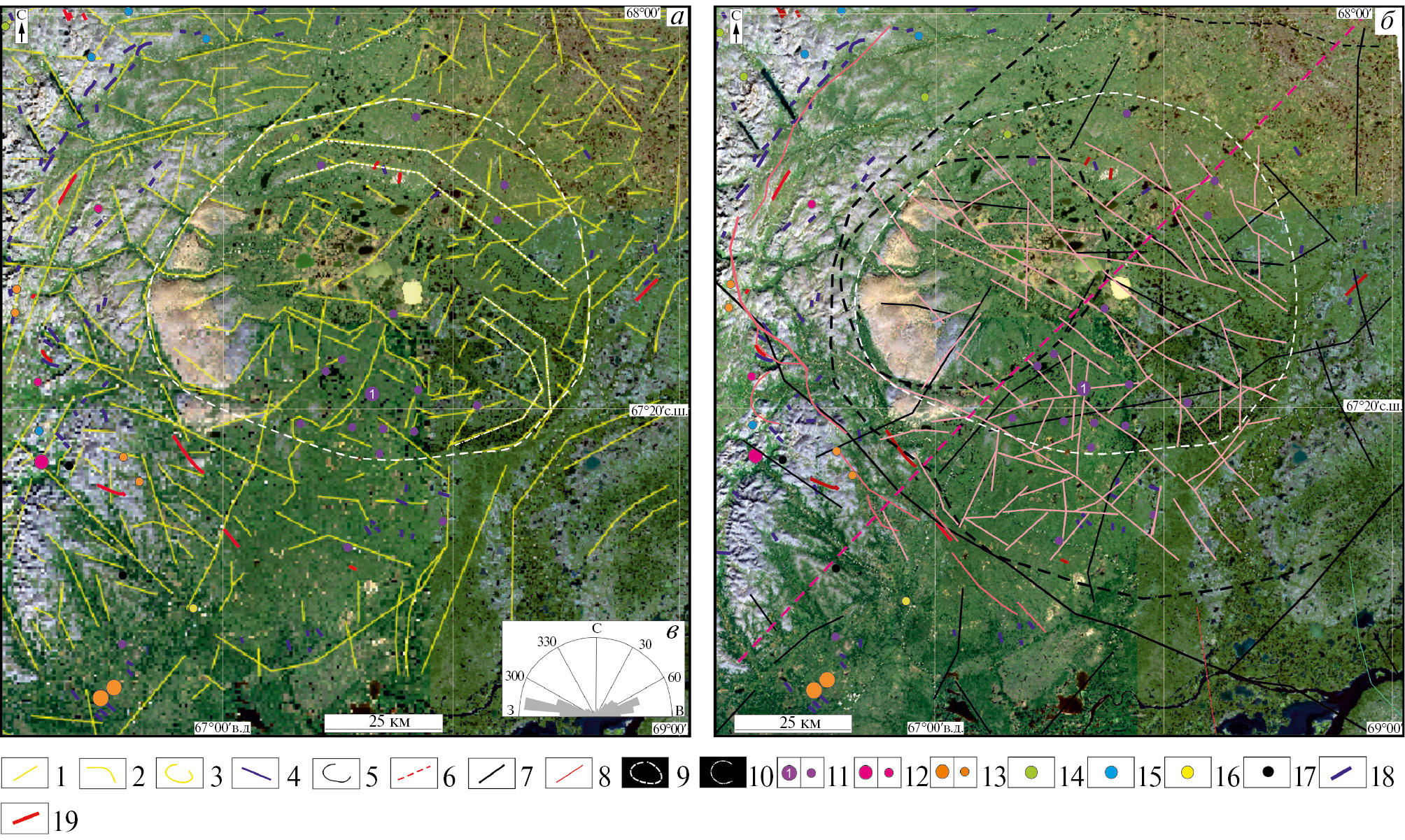 Рис. 6. Морфоструктурная карта площади исследования, полученная по данным КС КА HLS-2 и ЦМР (а) и КС КА HLS-2 в естественных цветах (RGB 4-3-2) с наложенными на них структурами, вынесенными со схемы предварительной комплексной интерпретации геофизических материалов по (Калмыков, Трусов, 2015) и с карты аномалии магнитного поля палеозойских комплексов Щучьинского синклинория по (Литвинов, Кудрявцев, 2011) (б): 1–3 – линеаменты радиальные и дуговые, кольцевые, полученные по КС КА HLS-2 и ЦМР (3), 4–8 – структуры, выделенные по геофизическим данным: 4 – ГУР, 5 – кольцевые и дуговые, выделенные по трансформанте TILT аномалии гравитационного поля (АГП), 6 – Ханмей-Сибилейская зона разломов; 7 – линии нарушенности корреляции геофизических аномалий, предположительно ассоциируемых с глубинными разломами (разрывными нарушениями 1-го порядка); 8 – линии нарушенности корреляции, предположительно связанные с разрывными нарушениями 2-го порядка, на карту вынесены линеаменты протяженностью более 10 км; 9 – палеовулканический аппарат центрального типа (морфоструктура 1-го порядка), 10 – дуговые структуры 2-го порядка; 11–17– соответствуют рис. 2, 18–19 – дайки основного (19) и кислого (б) состава. Роза-диаграмма составлена для линеаментов, выделенных ручным способом по КС КА HLS-2 и ЦМР (в).