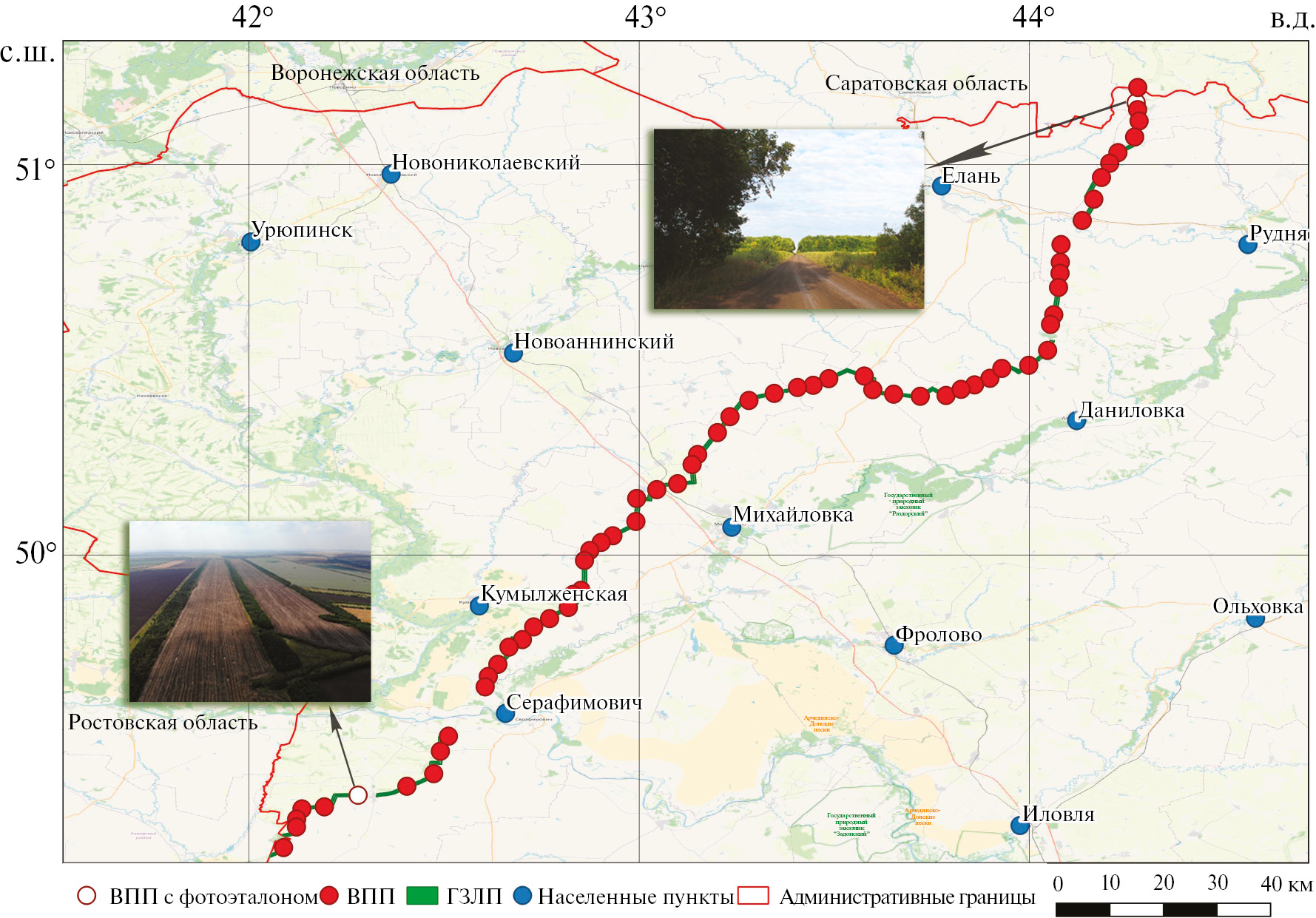 По полученным картографическим данным в ранее опубликованных работах (Выприцкий, Шинкаренко, 2022; Выприцкий, Юферев, 2023) были заложены 67 временные пробные площади (ВПП) с различными почвенно-климатическими условиями по всей протяженности ГЗЛП на территории Волгоградской области, на которых по общепринятым в лесной таксации методам (Турчин и др., 2021; ОСТ 56-69-83, 1983) проводилось определение таксационных показателей насаждений ГЗЛП “Пенза–Каменск”. ВПП были подобраны, как центральные точки, доступные для проведения таксационного описания кулис ГЗЛП, в котором происходило, во времена закладки лесной полосы древесного материала, начало или конец участка. В подавляющем случае рассматривались одновременно 3 кулисы (рис. 2).