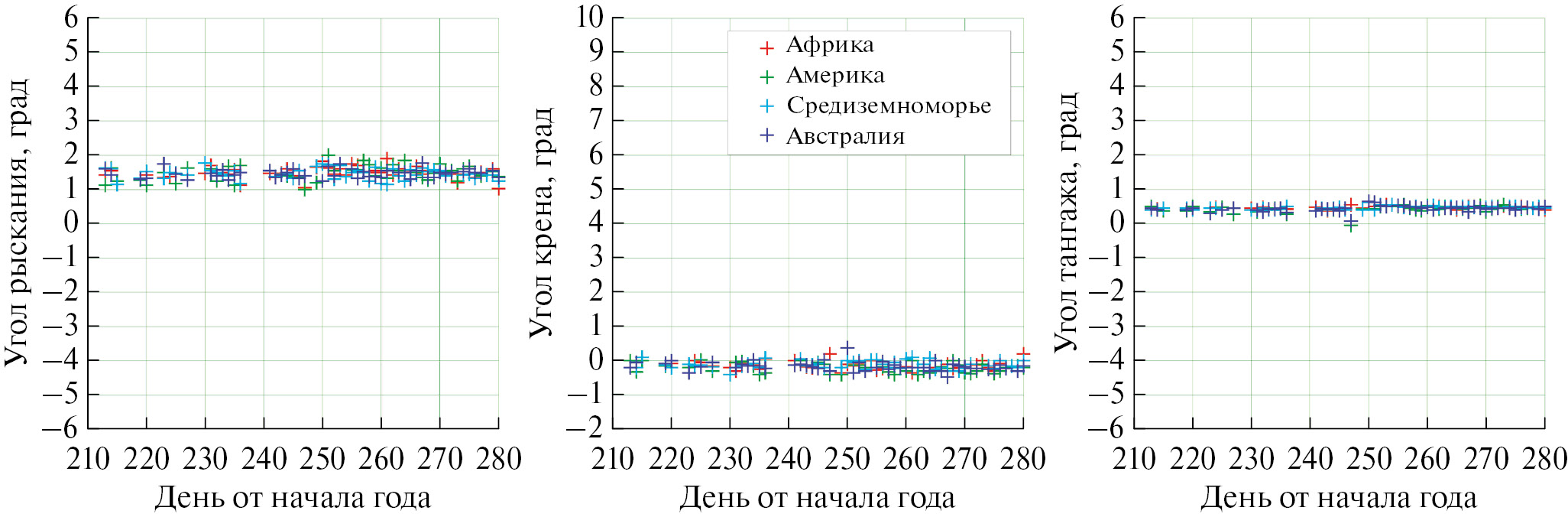 Как и в случае анализа данных прибора, функционировавшего на борту КА “Метеор-М” №2-2, получаемые значения не проявляют каких-либо временных трендов, достаточно хорошо сгруппированы. Данные, полученные для областей анализа “Австралия”, “Африка”, “Южная Америка” и “Средиземноморье” (на рис. 2 они обозначены различными цветами; конкретные географические границы этих регионов приведены в (Садовский и Сазонов, 2023)), также практически повторяют друг друга. При этом, более слабая функциональная зависимость целевой функции от угла рыскания, как и в указанной выше работе, приводит к наибольшей дисперсии оценок этого угла. Далее следует угол крена, имеющий схожее влияние на результаты геопривязки данных. Наименьший разброс демонстрируют восстановленные углы тангажа.
