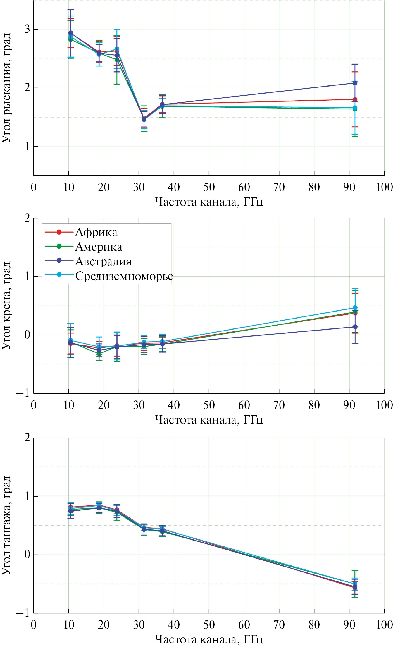 Полученные за двухмесячный период значения корректирующих углов усреднялись с последующим расчетов дисперсии каждого из них. На рис. 3 приведены результаты выполненных оценок по всем частотным каналам в графическом виде. Каждая точка на рис. 3 соответствует усредненному значению оцениваемого параметра, разброс соответствует полному значению дисперсии.