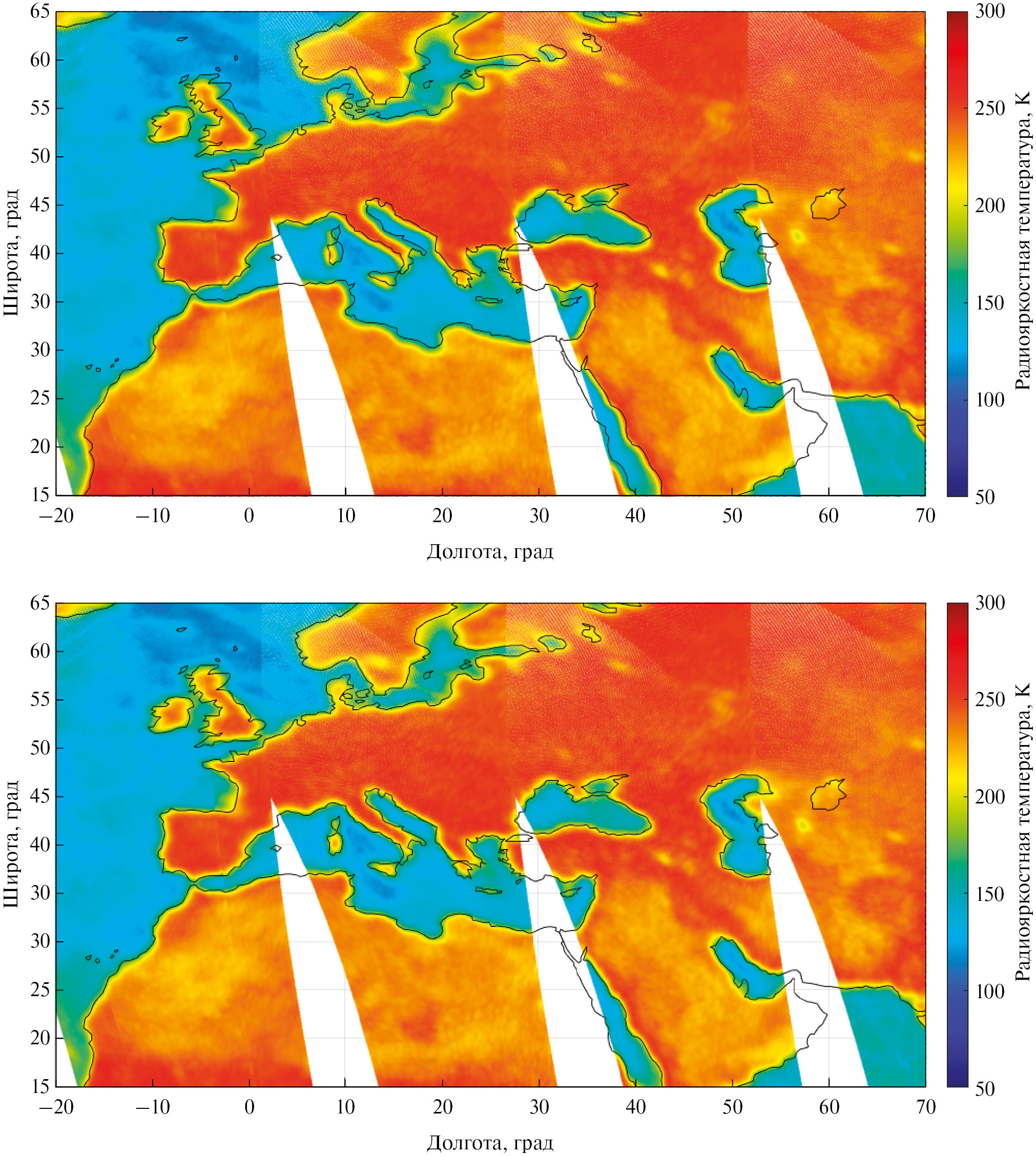 Для решения поставленной задачи использовался подход, детально описанный в (Садовский и Сазонов, 2023). Следует напомнить, что в нем используется предположение об отсутствии отклонений орбитальной системы координат от системы координат космического аппарата, а любые смещения точек визирования на поверхности относительно реперных географических объектов объясняются последовательным поворотом приборной системы координат относительно носителя на углы: крена, тангажа и рыскания. Результаты суточных измерений на горизонтальной поляризации для каждой частоты проходят процедуру независимой геопривязки (Садовский и Сазонов, 2022) и накладываются на регулярную сетку. После этого находится разность двух суточных композитов, отдельно сформированных для восходящих и нисходящих витков. Если геопривязка выполнена корректно, то карта их разности не будет содержать пикселей, где разница антенных температур превышает ее суточные изменения (не более 30 К для поверхности суши в отсутствии зон активных осадков). В противном случае, особенно вблизи береговых линий, будут появляться области с сильно завышенными значениями разности, по характеру которых надежно идентифицируется вызывающие эти изменения углы. Автоматизация указанной процедуры позволяет последовательно подобрать такие значения корректирующих углов крена, тангажа и рыскания каждого частотного канала, которые минимизируют количество несовпадающих пикселей в геопривязанных композитах на восходящих и нисходящих полувитках.