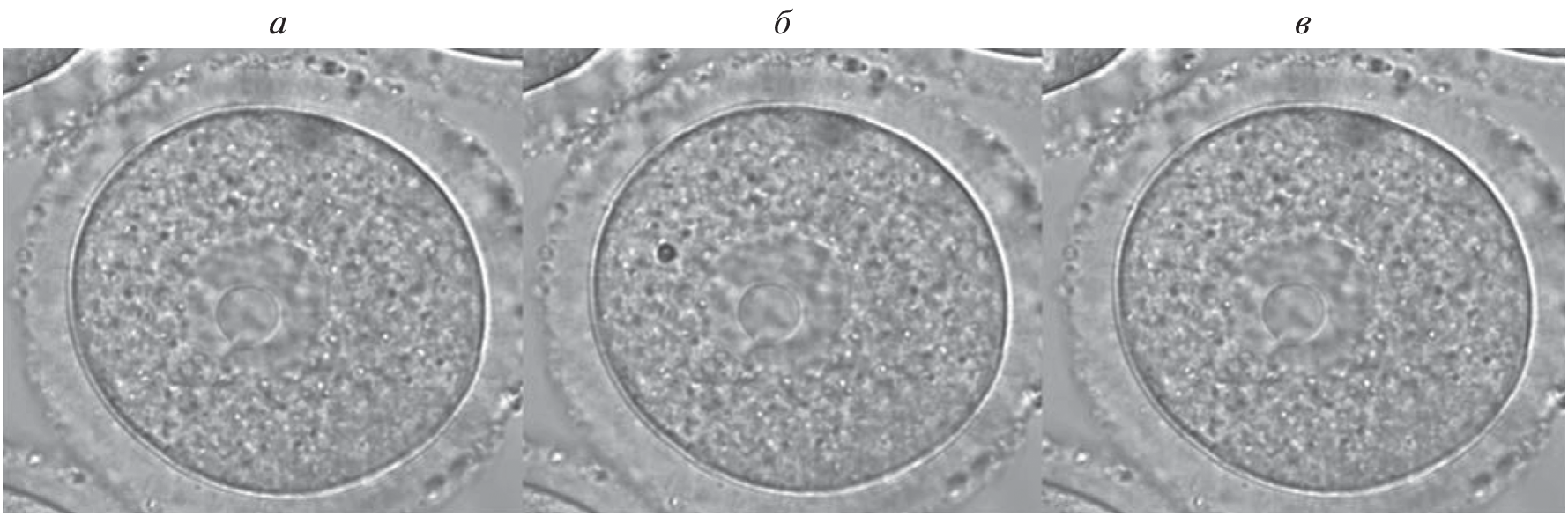 In this paper, we study the formation and dynamics of cavitation bubbles arising in different zones of preovulatory (GV) mouse oocytes as a result of optical breakdown under the action of femtosecond laser pulses with a wavelength of 790 nm. The dynamics of the growth and collapse of the cavitation bubble is determined from the time dependence of the scattered light intensity on the bubble. The difference in the thresholds of optical breakdown and the dynamics of the cavitation bubble between different regions of the oocyte and the aqueous buffer solution is numerically characterized.