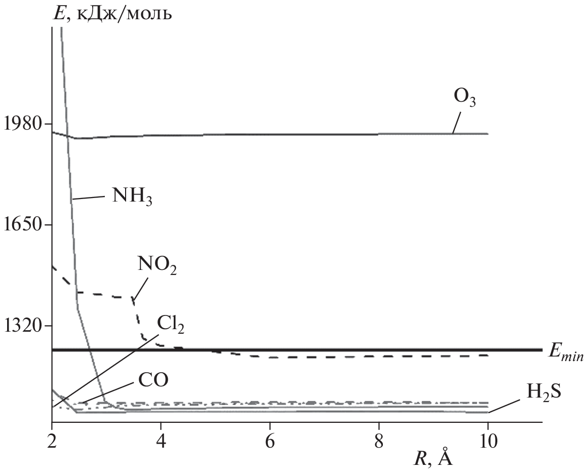 Оценена возможность адсорбции приоритетных газов-поллютантов (диоксида азота, метана, аммиака, оксида серы (II), сероводорода, озона, монооксида углерода, оксида углерода (II), хлора) на поверхности хромсодержащего пиролизованного полиакрилонитрила (пПАН). Построена модель кластера хромсодержащего пПАН (Cr–ПАН). Методом молекулярного моделирования в работе определены термодинамические показатели систем “кластер Cr–пПАН – молекула газа”, “кластер Cr–пПАН – молекула кислорода”, “кластер Cr–пПАН – молекула воды”, “кластер Cr–ПАН – молекула кислорода” – молекула газа, кластер Cr–пПАН – молекула воды – молекула газа и проведено их сравнение. Выявлены влияние молекулы воды на процесс адсорбции газов-поллютантов на поверхности кластера Cr–ПАН и отсутствие влияния молекулы кислорода, находящихся в непосредственной близости от кластеров. Установлено, что Cr–пПАН обладает свойством селективной адсорбции следующих газов: диоксида азота, хлора и аммиака. В рамках теории функционала плотности оценены силовые параметры структуры Cr–пПАН и подтверждено увеличение зоны контактной поверхности при внедрении в нее молекулы Cr2O3.