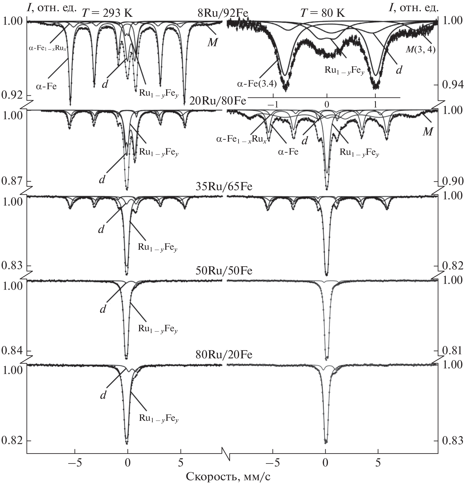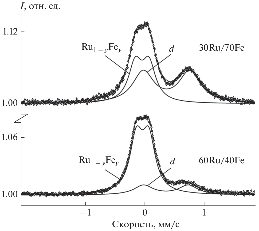 The interrelation of the structure and catalytic properties of hydrogen-reduced iron-ruthenium systems in the ammonia synthesis reaction is studied by X-ray diffraction (XRD), as well as conversion and absorption Mössbauer spectroscopy (MS). It is found that a sample with a metal content of 50Fe/50Ru (wt %) exhibits the maximum catalytic activity in the synthesis of ammonia. It is shown that Fe–Ru intermetallic nanoclusters with a coherent scattering region (CSR) of ~11 nm are formed in the binary system.