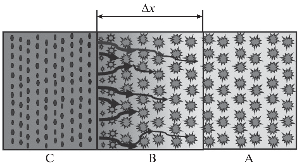 Процесс быстрого горения наноразмерных пористых смесей Al + CuO в кварцевых трубках исследован с помощью высокоскоростной видеосъемки. Математическая обработка кинограмм, полученных с использованием нейтральных светофильтров разной толщины, позволила определить скорости горения на различных участках трубки и экспериментально оценить размеры зон воспламенения и горения наноразмерного термита. Для объяснения механизма распространения горения предложена простая, основанная на законе Дарси, модель фильтрации горячих продуктов через макропоры. По результатам модельных экспериментов с горением наноразмерного термита в трубках с инертными преградами (стеклянные микросферы, воздушные промежутки) получены данные, которые позволили разработать простой алгоритм оценки проницаемости наноразмерной смеси и давления в зоне горения.