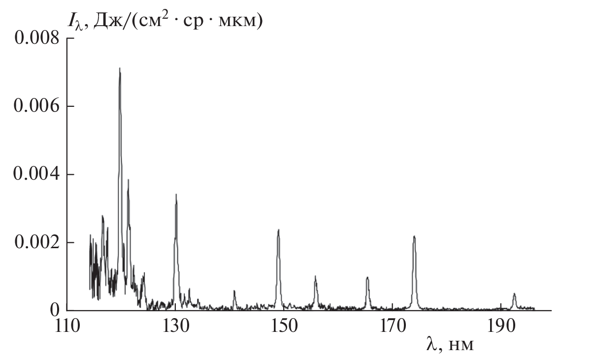 The results of measuring the integral and temporal spectral characteristics of shock-heated air are presented. The experiments are carried out on a modified two-sections SST-M shock tube of the Institute of Mechanics, Moscow State University in shock wave velocities ranging from 7.8 to 10.7 km/s and initial pressures in the low-pressure chamber of 0.125 and 0.25 Torr. The radiation wavelength range 115–195 nm, corresponding to the vacuum ultraviolet (VUV) spectral region, in which the main contribution to the radiation is made by the atomic lines of nitrogen and oxygen, is studied. The obtained radiation spectrograms are analyzed. The measurement data are compared with the available experimental data of other authors.