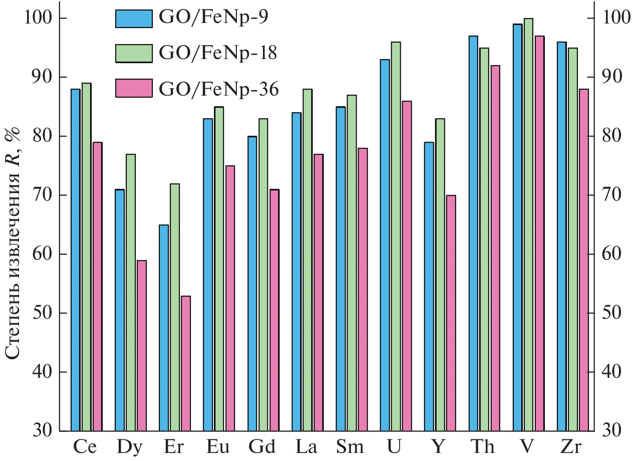 In this study, aerogels based on graphene oxide decorated with iron oxide nanoparticles are obtained by drying in supercritical isopropanol. For the synthesized samples with the calculated initial iron contents of 9, 18 and 36 wt %, the morphology and structure of the graphene matrix and iron-containing nanoparticles are studied using the scanning electron microscopy (SEM) and transmission electron microscopy (TEM) methods. Comparative investigations are conducted to analyze the carbon and hydrogen composition within the synthesized aerogels structure, followed by an assessment of their magnetic properties at ambient temperature. Sorption experiments are carried out for the extraction of heavy and rare earth elements from multicomponent aqueous solutions of a complex composition.