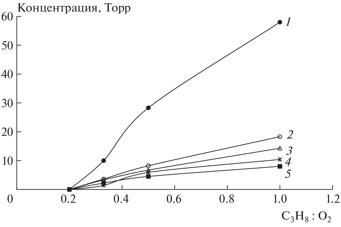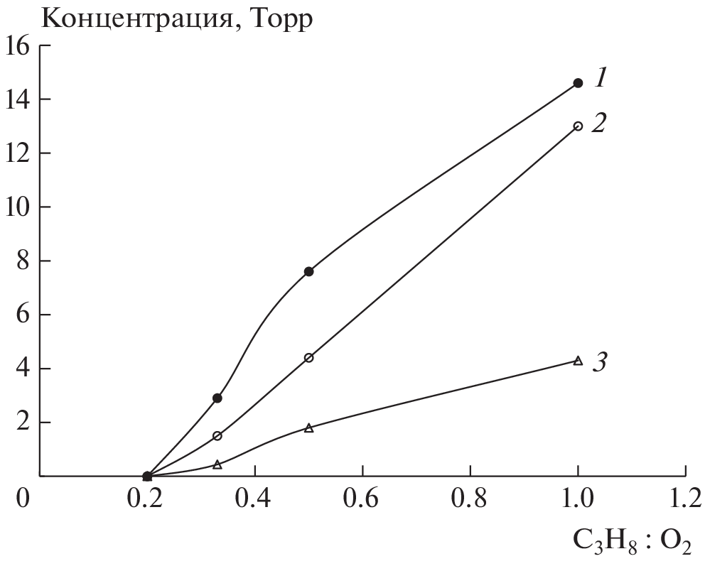 It is experimentally shown that in the studied range of reagent ratios of propane/oxygen mixtures (C3H8 : O2 = 1 : 1–1 : 5), an increase in the oxygen content leads to a decrease the intensity of the stabilized cool propane flame. It is established that with an increase in the oxygen content, the selectivity of the formation of formaldehyde and acetaldehyde increases, and the selectivity of the formation of methanol decreases, which can be explained by the competition of the reactions of their formation.