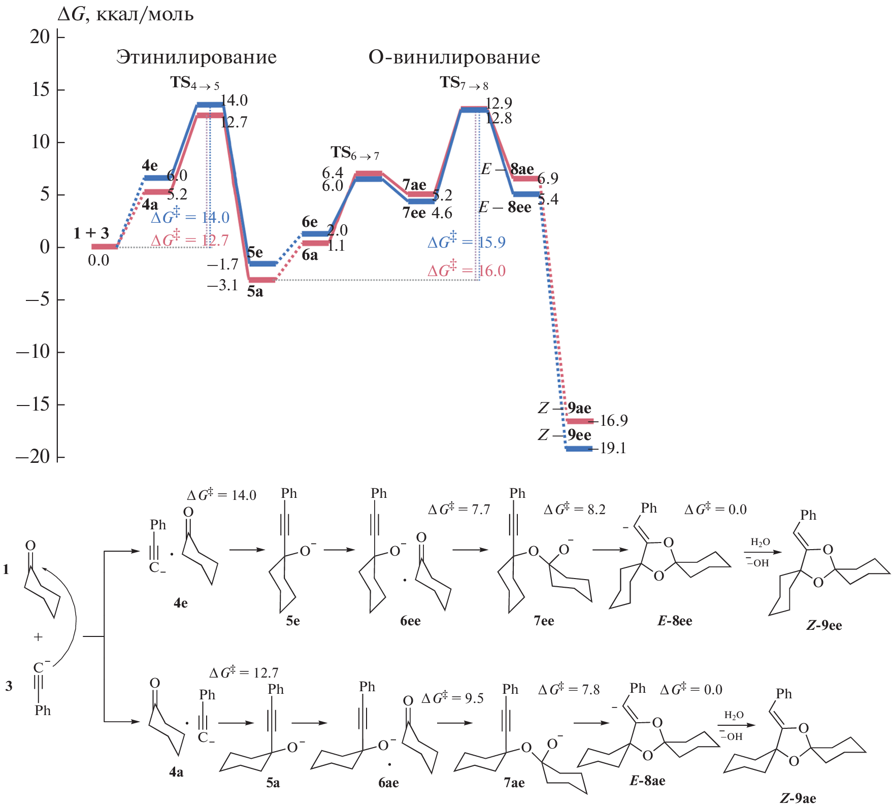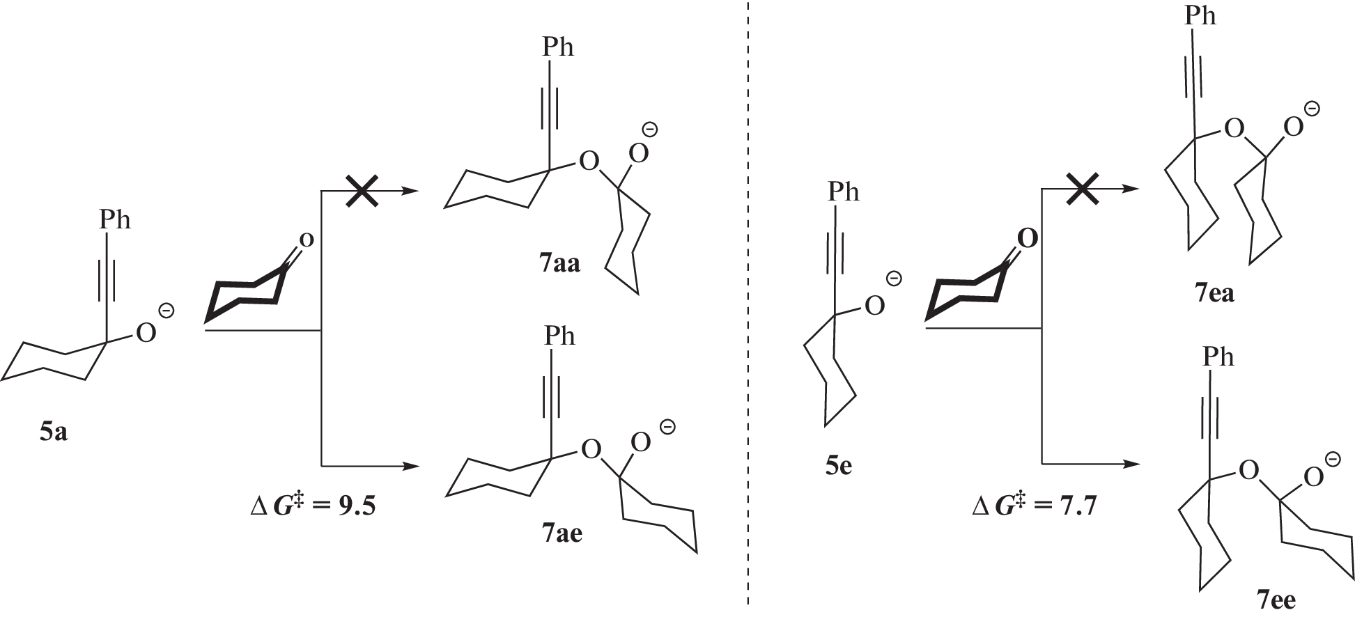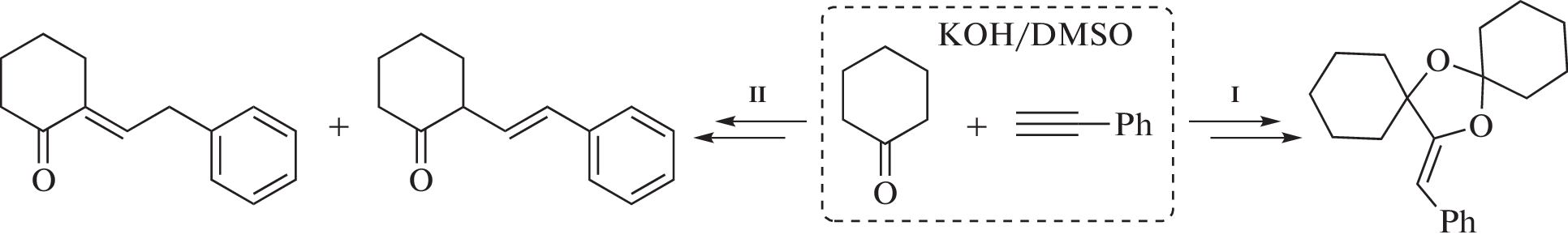 The formation mechanisms of 15-[(Z)-phenylmethylidene]-7,14-dioxadispiro[5.1.5.2]pentadecane and the competitive formation of unsaturated ketones from cyclohexanone and phenylacetylene are studied using the B2PLYP-D2/6-311+G**//B3LYP/6-31+G* quantum chemical approach, taking into account solvation effects within the IEFPCM model. All stages of the assembly of dispiroketal and the stability of various conformers and isomers of the intermediates and the product are considered using the anionic model (ANIONGAS). Within the more detailed MONOPCM model, the activation barriers of the assembly of dispiroketal and the competing reaction of C-vinylation are evaluated. The obtained results of the quantum chemical calculations are in close agreement with the experimental data.