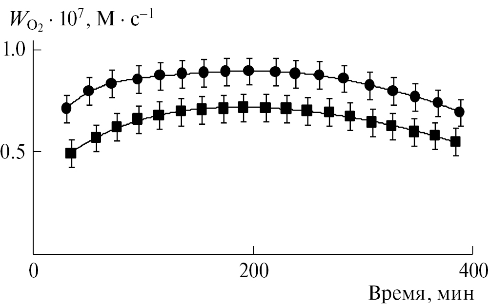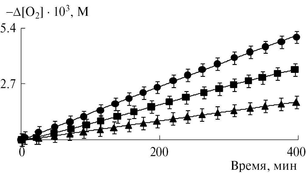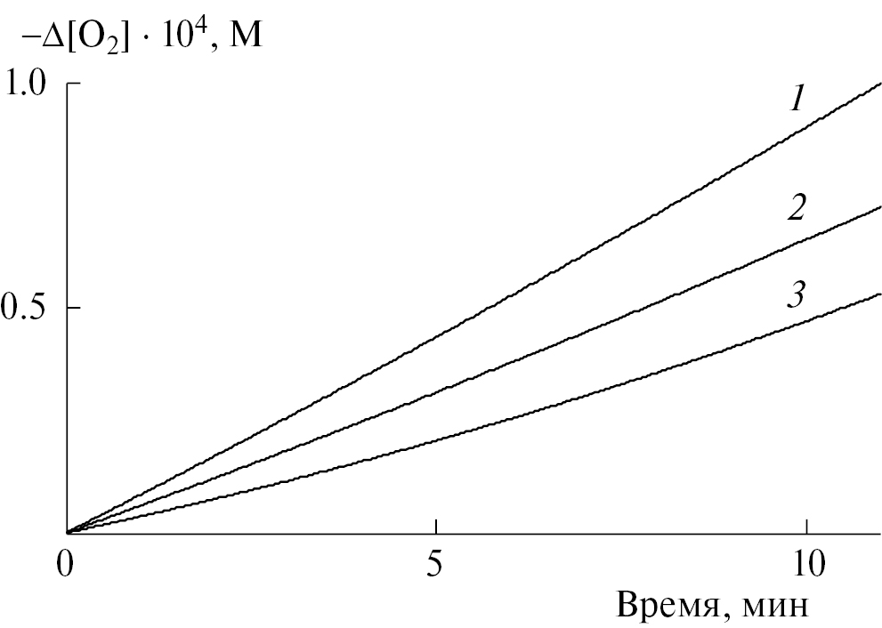 Эксперименты проводили при (310.0 ± 0.1) К в термостатированной ячейке объемом 3 мл в условиях энергичного перемешивания реакционной смеси. Скорость окисления (Wo2) измеряли по тангенсу угла наклона кинетических кривых уменьшения [O2] в исследуемом растворе. Все первичные экспериментальные данные обрабатывались по оптимизационной программе Kinetics 2012 версии 2.0 [26].