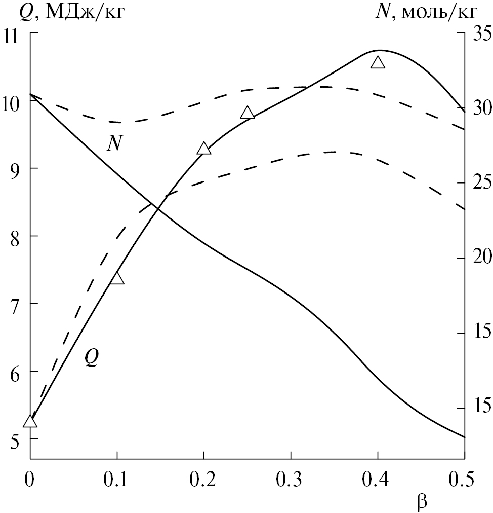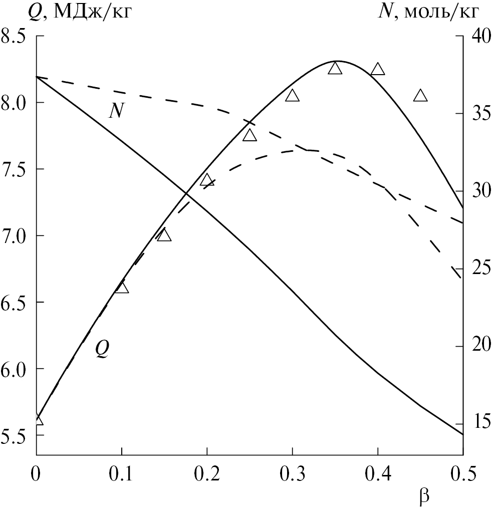 Рис. 1. Теплота взрыва (Q) и число молей газообразных продуктов взрыва (N) в зависимости от β массовой доли Al (сплошные линии) и AlH3 (штриховые линии) в смеси с октогеном. Символы — экспериментальные значения теплоты взрыва алюминийсодержащих составов.