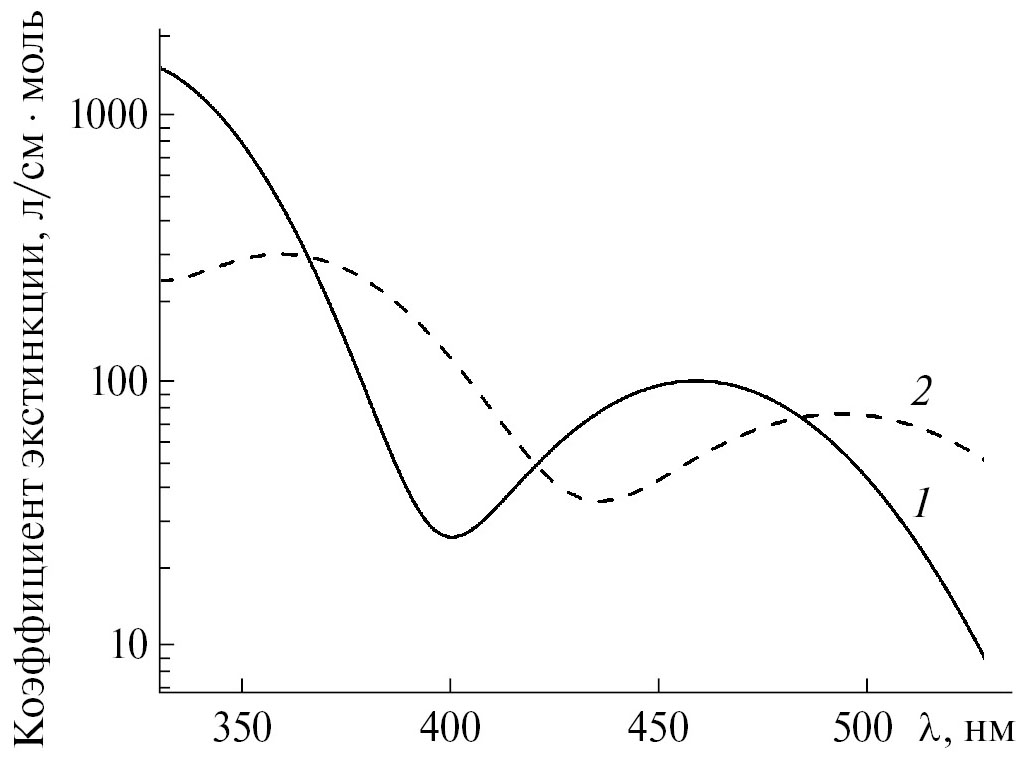 Рис. 1. Коэффициент экстинкции изомеров [Co(NH3)5NO2]2+ (1)и [Co(NH3)5ONO]2+ (2) в водном растворе. Данные взяты из работы [8].