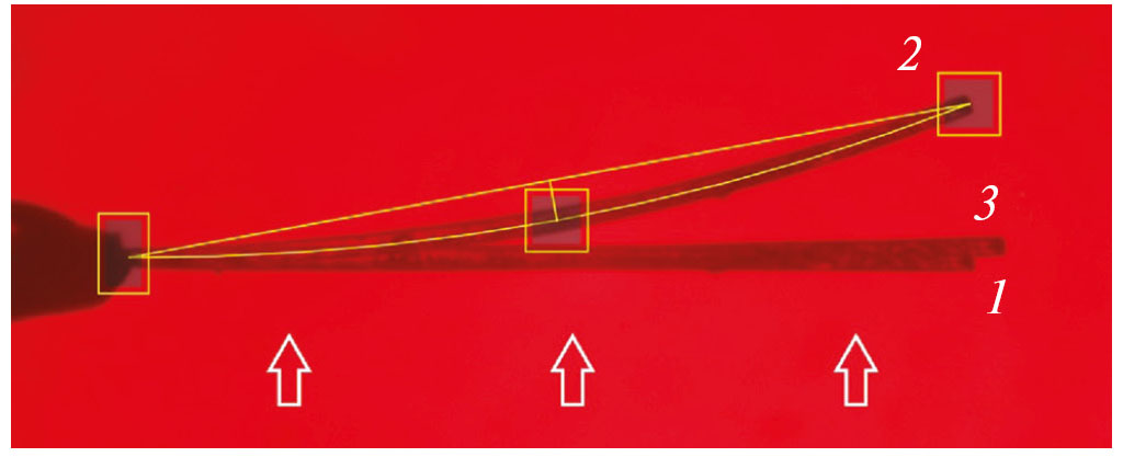 Для получения представления о наблюдаемой деформации кристалла на рис. 4 показано совмещенное изображение трех последовательных состояний: 1 — начальное состояние кристалла, 2 — состояние в пике кривизны на первом этапе засветки источником с длиной волны 425 нм (также показаны метки, используемые алгоритмом анализа формы кристалла), 3 — пик кривизны на этапе засветки источником с длиной волны 350 нм. Сравнение изображений 1 и 3 позволяет получить представление о достигаемом в этот момент (~104 с, см. рис. 3a и 3б) удлинении кристалла в ~3.7%, и отклонении от геометрии кристалла, вызванном кривизной, – 1/R ~ 0.4 см–1.