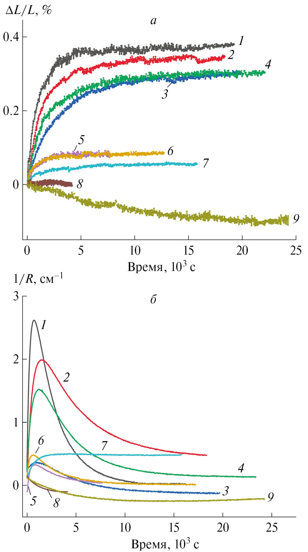 Рис. 5. Кинетика изменения удлинения (a) и кривизны (б) кристалла [Co(NH3)5NO2]Cl(NO3), вызываемая переключениями источников излучения: 1 — 403 → 350 нм, 2 — 403 → 375 нм, 3 — 403 → 425 нм, 4 — 403 → 465 нм, 5 — 425 → 350 нм, 6 — 465 → 350 нм, 7 — 465 → 375 нм, 8 — 465 → 425 нм, 9 — 465 → 491 нм.