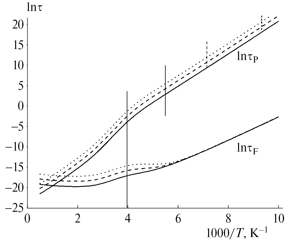 На рис. 1 изображена зависимость времен жизни от обратной температуры при разных концентрациях ловушек. Переход между двумя температурными интервалами, описанными выше, происходит в окрестности T = 250 K (длинная вертикальная черта).