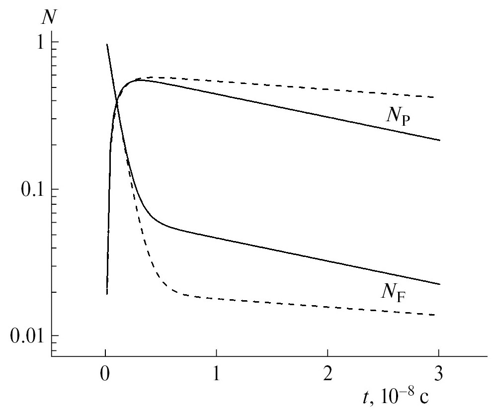 Рис. 2. Кинетические кривые релаксации населенностей свободных и связанных поляронов при концентраци ловушек c = 1.9 мол. %; при T = 700 K (сплошные линии) и T = 600 K (штриховые линии).
