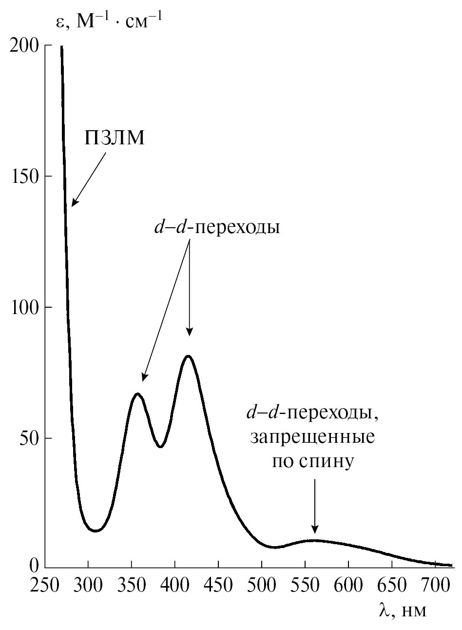 Основное состояние комплекса [IrIIICl6]3– имеет симметрию 1A1g(2t2g)6. Электронный спектр поглощения комплекса в водном растворе (рис. 1) совпадает с представленными в литературе [14, 17, 22]. Справедливость выполнения закона Ламберта–Бэра была проверена в рабочем диапазоне концентраций 10–3—10–2 М. Малоинтенсивные полосы с максимумами при 416 и 358 нм соответствуют разрешенным по спину d–d-переходам 1A1g → 1T1g и 1A1g → 1T2g [17]. Очень слабое поглощение в области 500–700 нм обусловлено запрещенными по спину d–d-переходами 1A1g → 3T1g и 1A1g → 3T2g [17]. Поглощение в синей области является хвостом интенсивной полосы переноса заряда лиганд–металл (ПЗЛМ) p(Cl) → 2e2g с максимумом при λ = 206 нм [14]. Облучение в экспериментах по лазерному импульсному фотолизу (266 нм) соответствовало именно этой полосе.