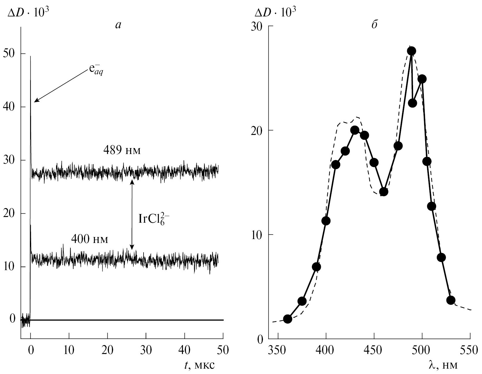 Рис. 2. Результаты эксперимента по лазерному импульсному фотолизу (266 нм, 5.3 мДж/импульс) комплекса [IrIIICl6]3– в водном растворе (1.0 · 10–3 M, кювета с длиной оптического пути 1 см, естественное содержание кислорода): a — примеры кинетических кривых, б — спектр промежуточного поглощения (точки, соединенные сплошной линией) на стационарном участке кинетических кривых (время задержки между возбуждающим и зондирующим импульсами >3 мкс). Штриховая линия — форма спектра комплекса [IrIVCl6]2–.