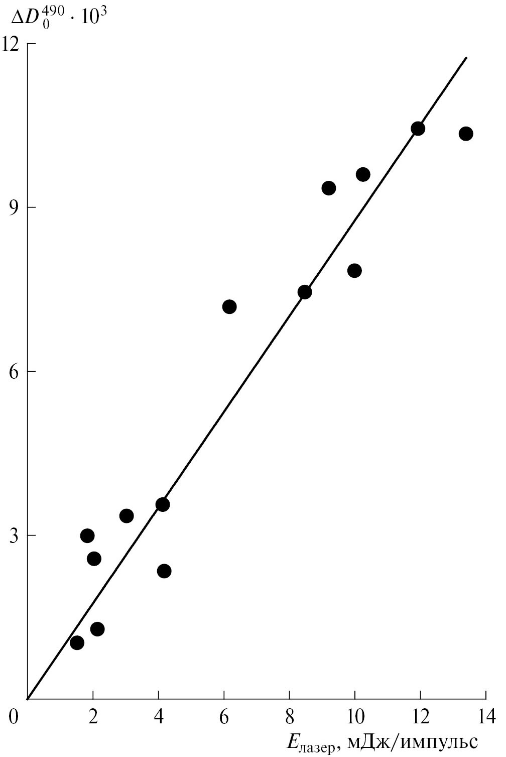 Рис. 4. Результаты эксперимента по лазерному импульсному фотолизу (266 нм) комплекса [IrIIICl6]3 — в водном растворе (1.6 · 10–3 M, кювета с l = 1 см, раствор продут аргоном). Зависимость начального поглощения D0 (490 нм) образующегося комплекса [IrIVCl6]2– от энергии лазерного импульса.