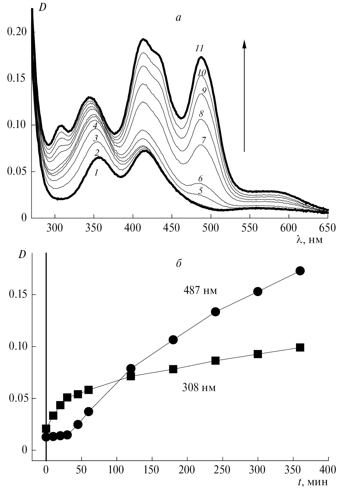 Рис. 6. Результаты эксперимента по стационарному фотолизу (254 нм). Изменение ЭСП в ходе облучения комплекса [IrIIICl6]3– в 2.5 M водном растворе HClO4 с концентрацией 8.9 · 10-4 M (кювета с l = 1 см, воздушно-насыщенный раствор). a — Изменение ЭСП в ходе облучения, кривые 1–11 соответствуют времени облучения 0, 10, 20, 30, 45, 60, 120, 180, 240, 300, 360 мин; б — динамика изменения поглощения на длинах волн 308 и 487 нм.