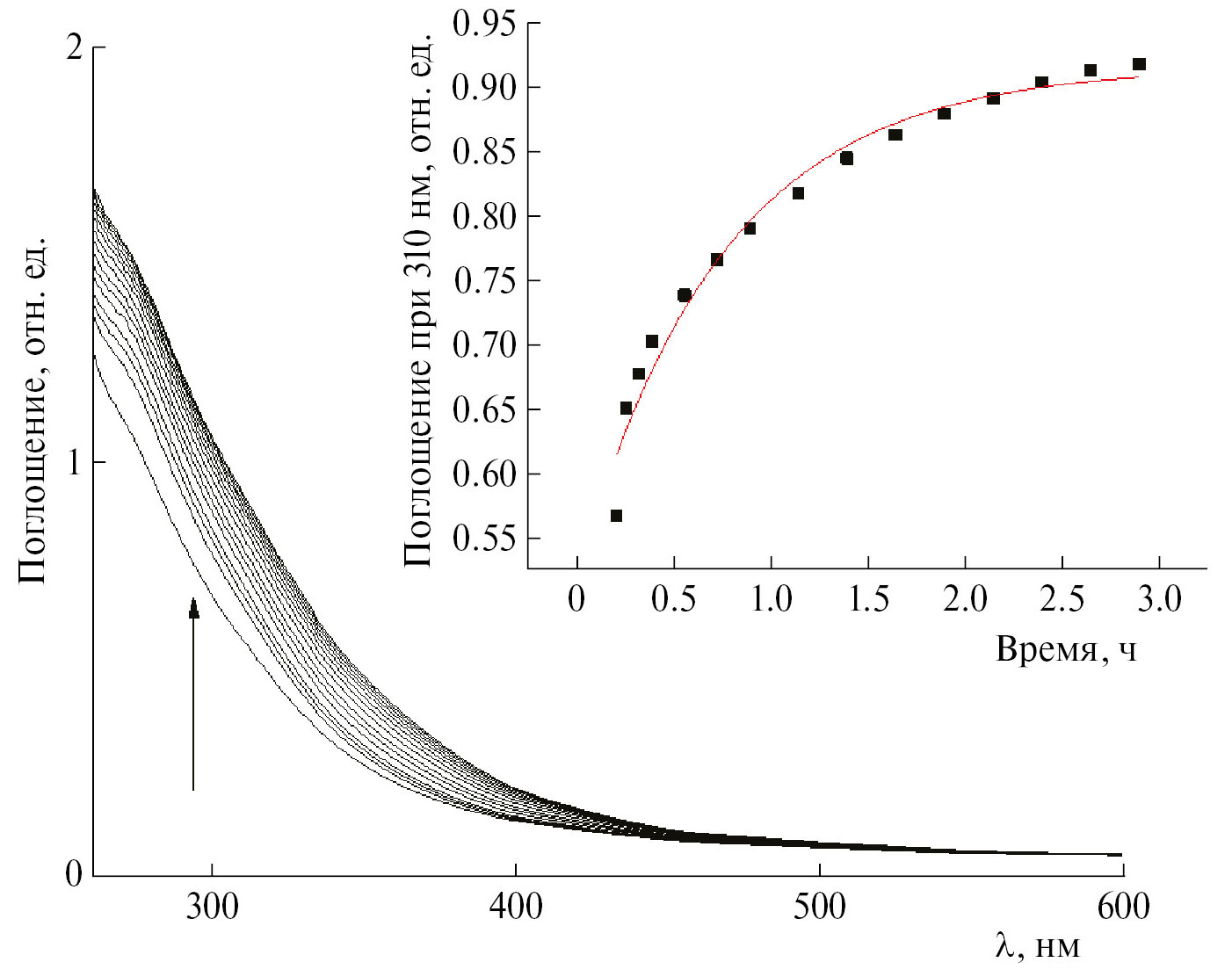 УФ-спектры поглощения регистрировали в диапазоне длин волн 200–600 нм через определенные интервалы времени при комнатной температуре на спектрофотометре Cary 60 UV-Vis производства компании Agilent Tech. (USA).