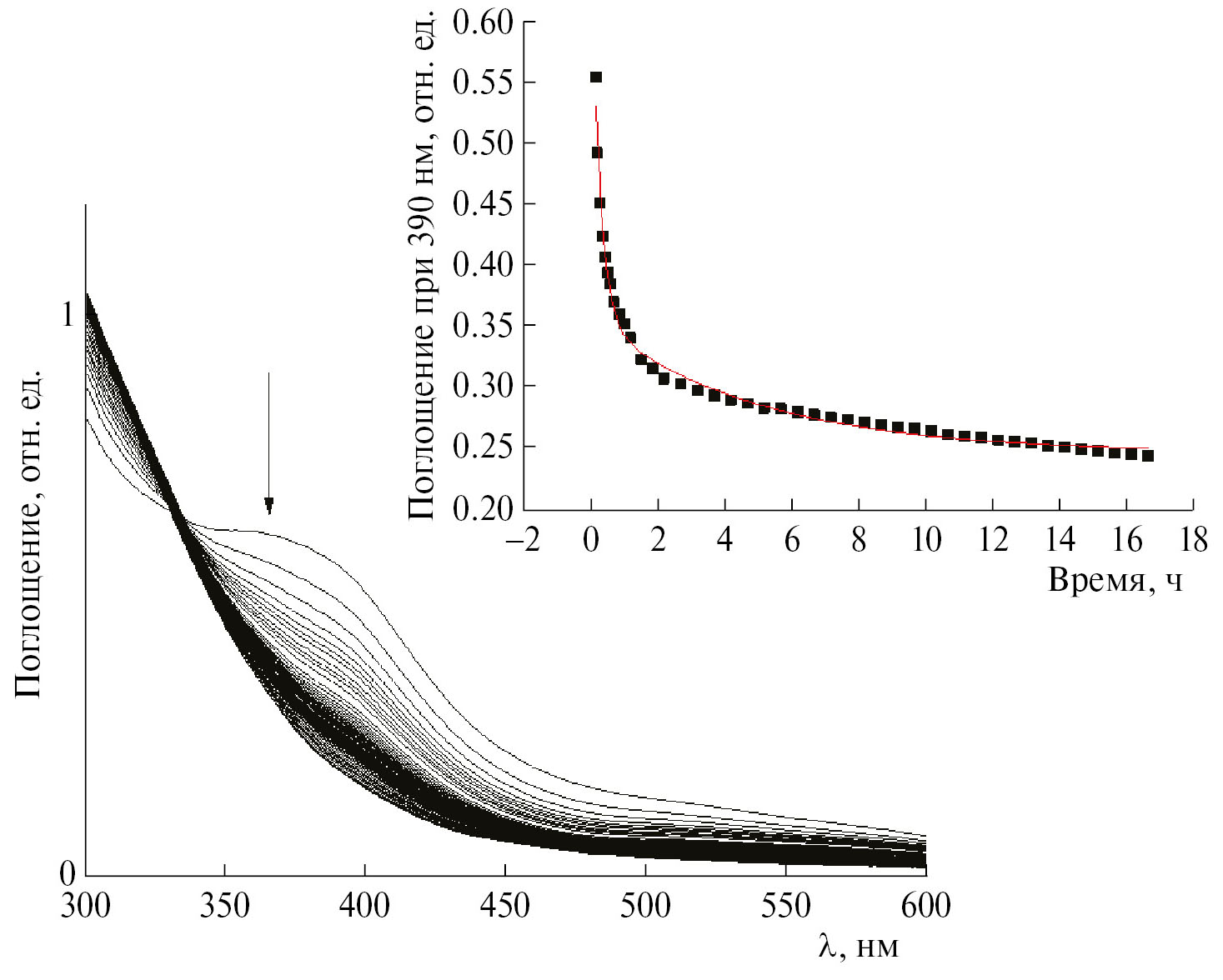 Рис. 4. Изменение спектров поглощения комплекса 1 в присутствии GSH. Условия реакции: концентрация комплекса 1 — 0.8 ∙ 10–4 М, концентрация GSH — 3.2 ∙ 10–4 M, температура — 23 °C, растворитель — 0.05 M Трис-HCl-буфер с pH 7.0. Константа скорости начального процесса составила k = (5.3 ± 0.6) ∙ 10–4 с–1.
