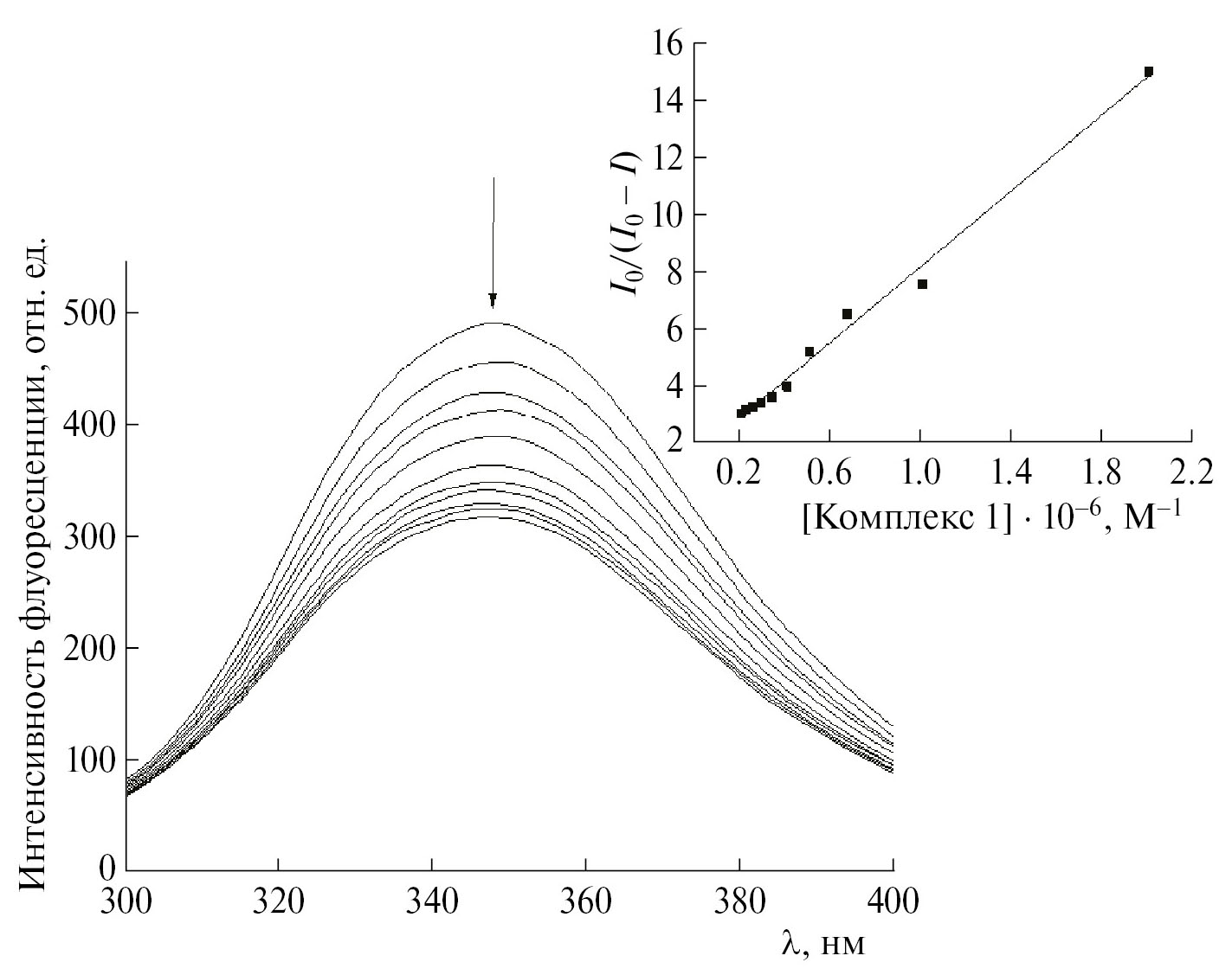 Согласно литературным данным собственная флуоресценция BSA обусловлена наличием двух аминокислотных остатков: триптофана Trp 213 и Trp 134, которые флуоресцируют независимо друг от друга с примерно равной интенсивностью [37]. На рис. 5 показано изменение спектров флуоресценции альбумина при титровании его раствором комплекса 1. Исходная интенсивность флуоресценции белка уменьшается на 40% после окончания добавления комплекса 1. Также наблюдается небольшой сдвиг спектра в синюю область.